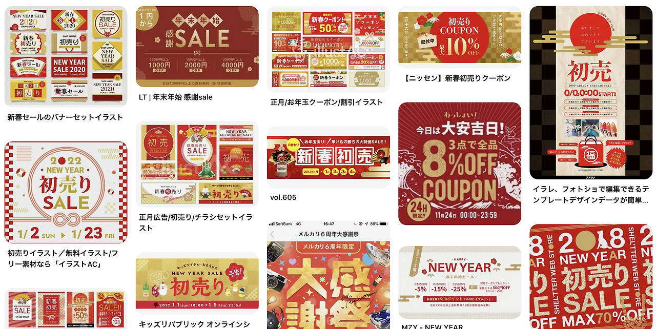 위 이미지는 일본에서 가장 대표적인 신년 세일(初売り - 하츠우리)을 핀터레스트에 검색했을 때 나오는 이미지입니다. 각각 다른 곳에서 진행되는 신년세일이지만, 디자인 톤이 비슷하지 않나요? 이렇게 일본은 시기마다 진행되는 프로모션별로 전형적인 디자인 톤과 정서가 강한 나라입니다.