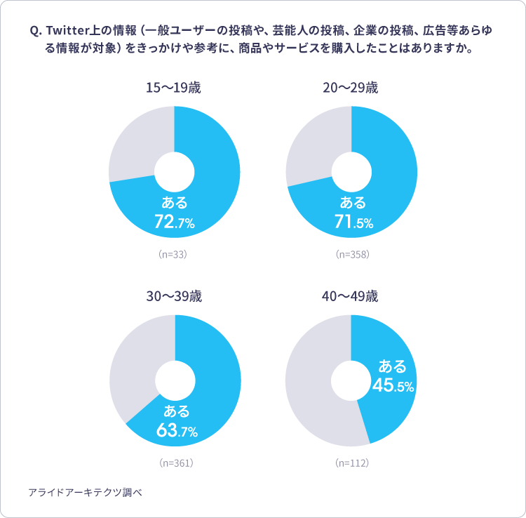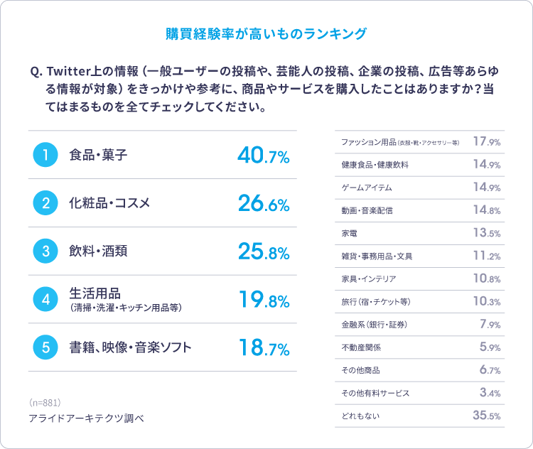 트위터 조사에 따르면 특히 젊은 연령층(15~29)의 약 70% 이상이 Twitter상의 정보를 계기로 어떠한 구입 경험이 있다고 응답하고 있습니다. 또한 다른 연령층에서도 폭넓게 구입 경험이 있는 것으로 드러나, 즉 트위터는 폭넓은 연령대의 구매 행동에 영향을 주고 있는 것을 알 수 있습니다. 그중에서도 1. 식품·과자, 2. 화장품, 3. 음료·주류 등, 일상적으로 소비되는 것에 특히 영향력이 큰 경향이 있습니다.