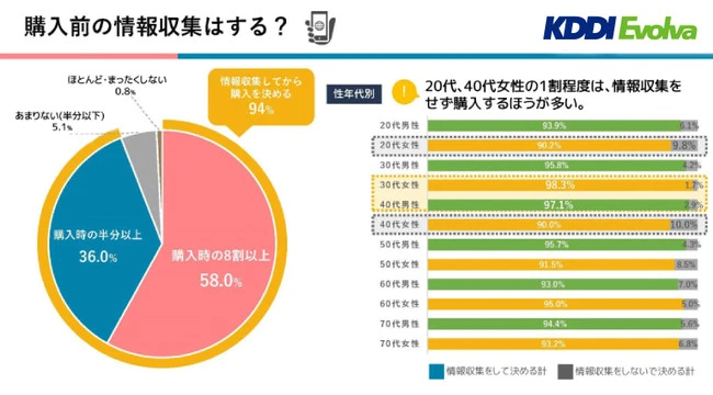 주식회사 KDDI 에볼바에서 조사한 “EC·통판 유저 동향 조사 리포트 2021”에 따르면, 정보수집을 하고 나서 상품을 구매한 사람이 94%, 특히 30대 여성이 98.3%, 40대 남성이 97.1% 로 정보 수집을 하는 비율이 높은 결과가 나왔습니다.