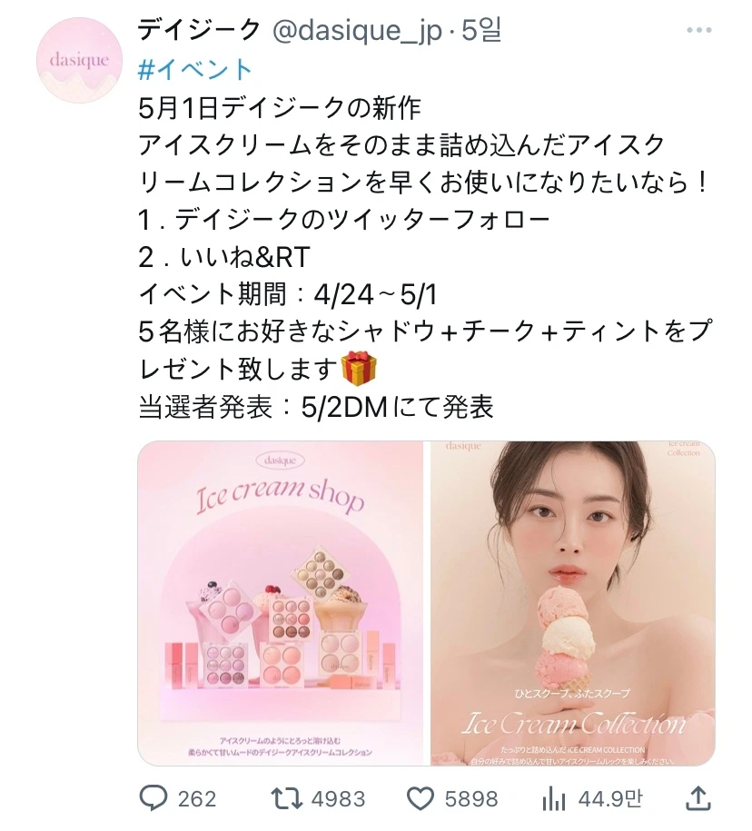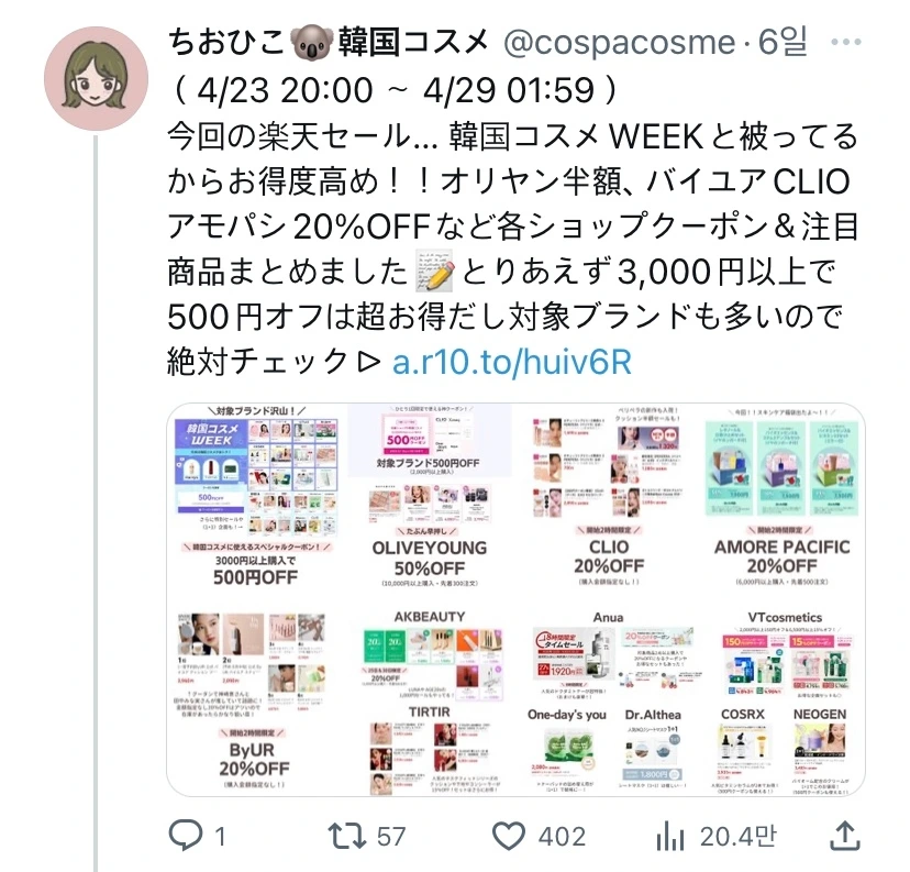위 이미지는 한국 화장품에 대해서 새로운 정보를 제공하는 계정입니다. 일본의 각종 EC사이트의 세일기간에 맞춰서 추천하는 한국 화장품 리스트를 올리거나 한국 아이돌이 실제 사용하고 있는 제품들을 소개하기도 합니다. 이런 정보들은 한국 화장품에 관심이 많은 10-20대 유저가 정보를 습득&리트윗을 하면서 광고 효과 및 구입까지 유도하고 있습니다.