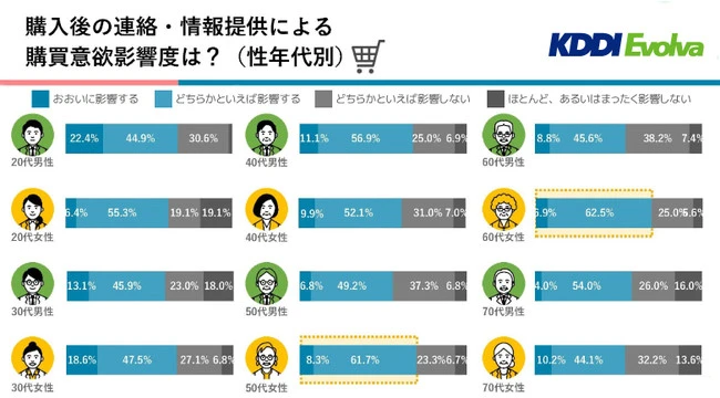 또한, “기업 측에서 구입 후의 연락이나 정보 제공에 의해, 다른 상품에 흥미를 가지거나 재구입시에도 이용하는 등, 구입 의욕에 영향은 있습니까?” 의 질문에서는 전체의 6할 이상이 구매 의욕에 영향을 준다고 답변을 했습니다.