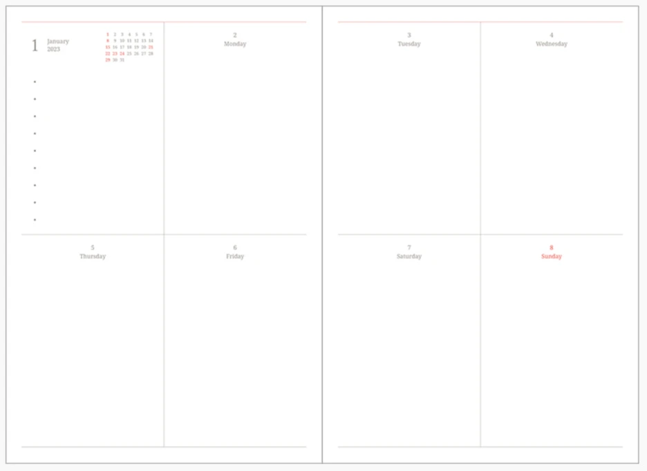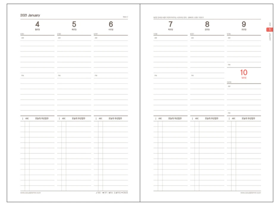 신입시절에는 1D1P(한 페이지에 1일)구성으로 쓰다가, 짬 좀 찬다음 2D1P(한 페이지에 2일), 나중에는 1W2P(양쪽 페이지에 한 주) 로 진화함.