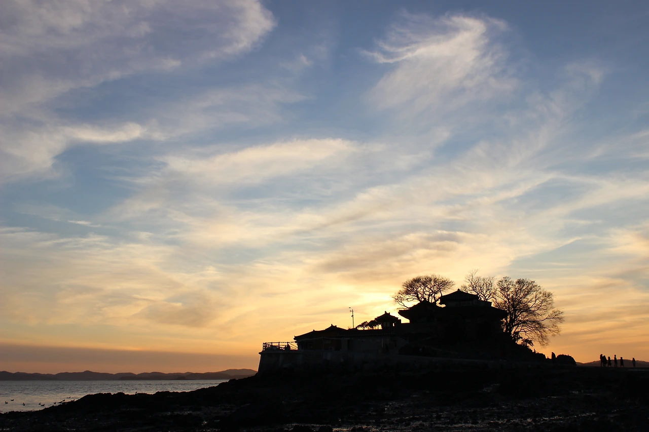 2. 해가 지고 난 직후 붉은 빛이 하늘에 남아 있을 땐 간월도에서 간월암으로 연결된 길과 계단에서 촬영하면 붉고 푸른 배경의 변화 무쌍한 구름을 촬영할 수 있다.