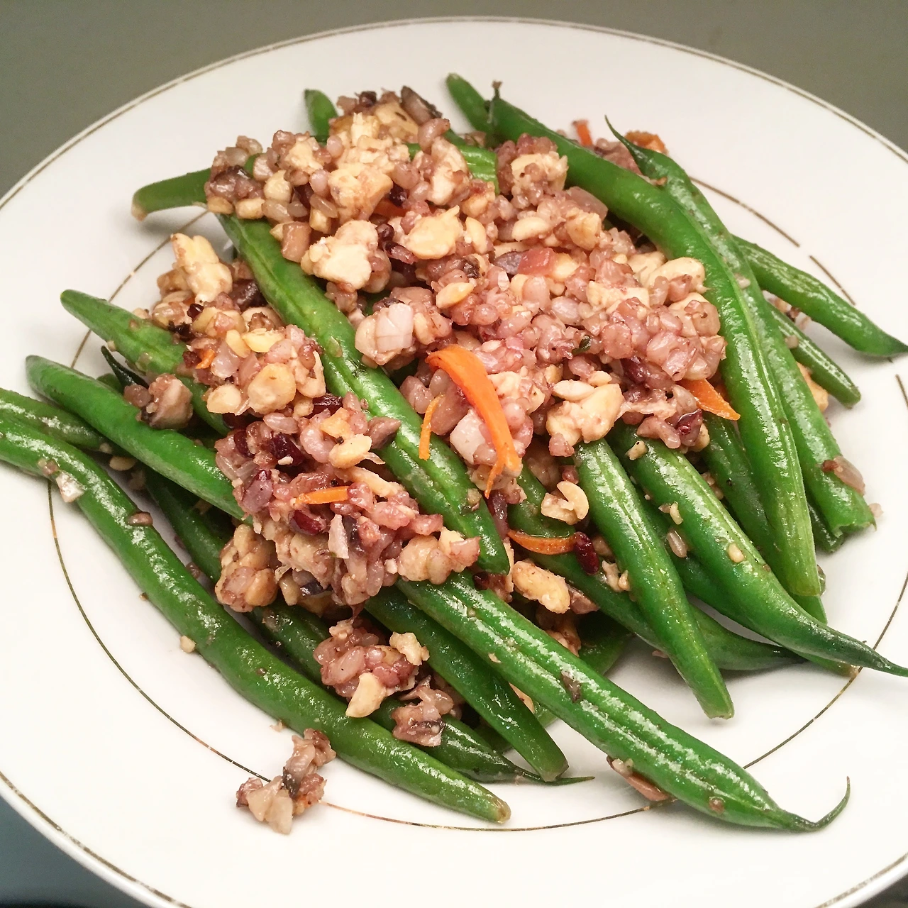 밥 두 공기, 템페 100g, 깍지 콩 한 움큼,
