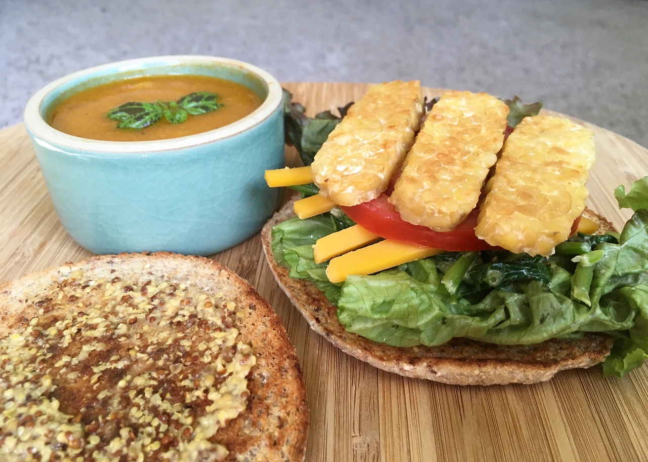 *템페 대신 두부를 쓸 수 있다. 단단한 두부를 0.7mm 두께로 잘라서 기름을 넉넉히 두른 팬에 지진다. 겉이 노릇하고 단단해지면 한 김 식힌 다음 샌드위치 재료로 쓴다.
