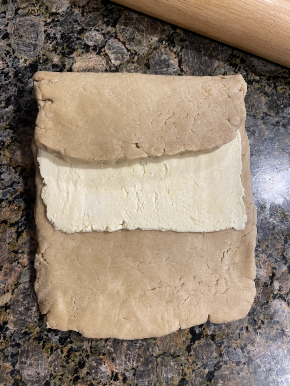 성형 중 반죽이 얇은 부분으로 버터가 삐져나올 수 있다. 안 그래야 모양 잡기가 수월하지만, 일단 터진 부분은 너무 괘념치 말자. 스크레이퍼로 반죽을 뒤집어서 버터가 삐져나온 부분이 안쪽으로 말리도록 성형한다. 버터가 터져서 너무 질척한 반죽이나 자투리 반죽은 따로 모아서 일정하게 모양을 잡아 굽는다. 그 안에 초콜릿/건포도/견과 등을 넣어 구울 수도 있다. <플렉시테리언 다이어리> p.103