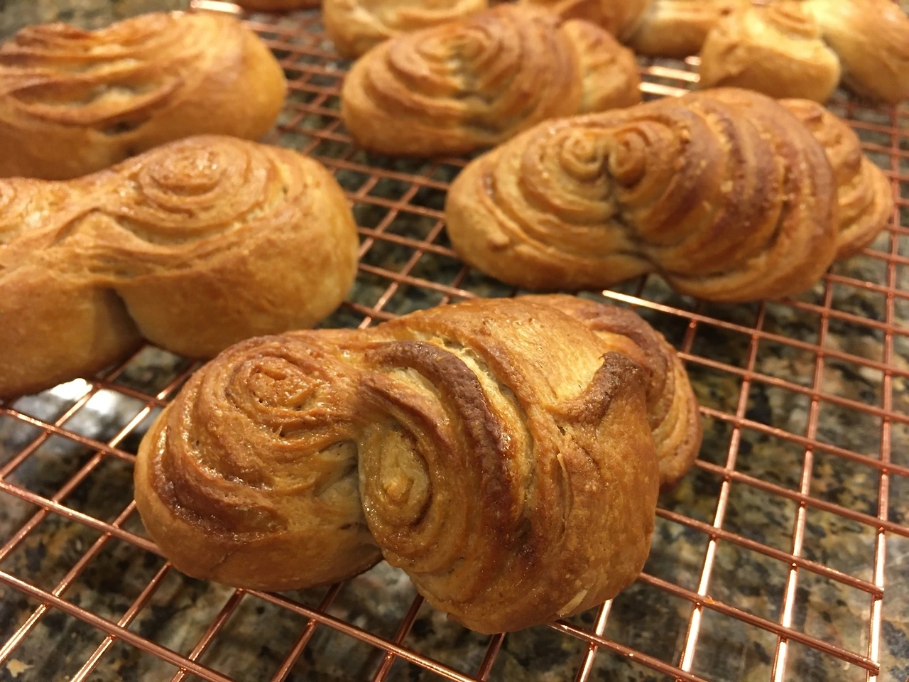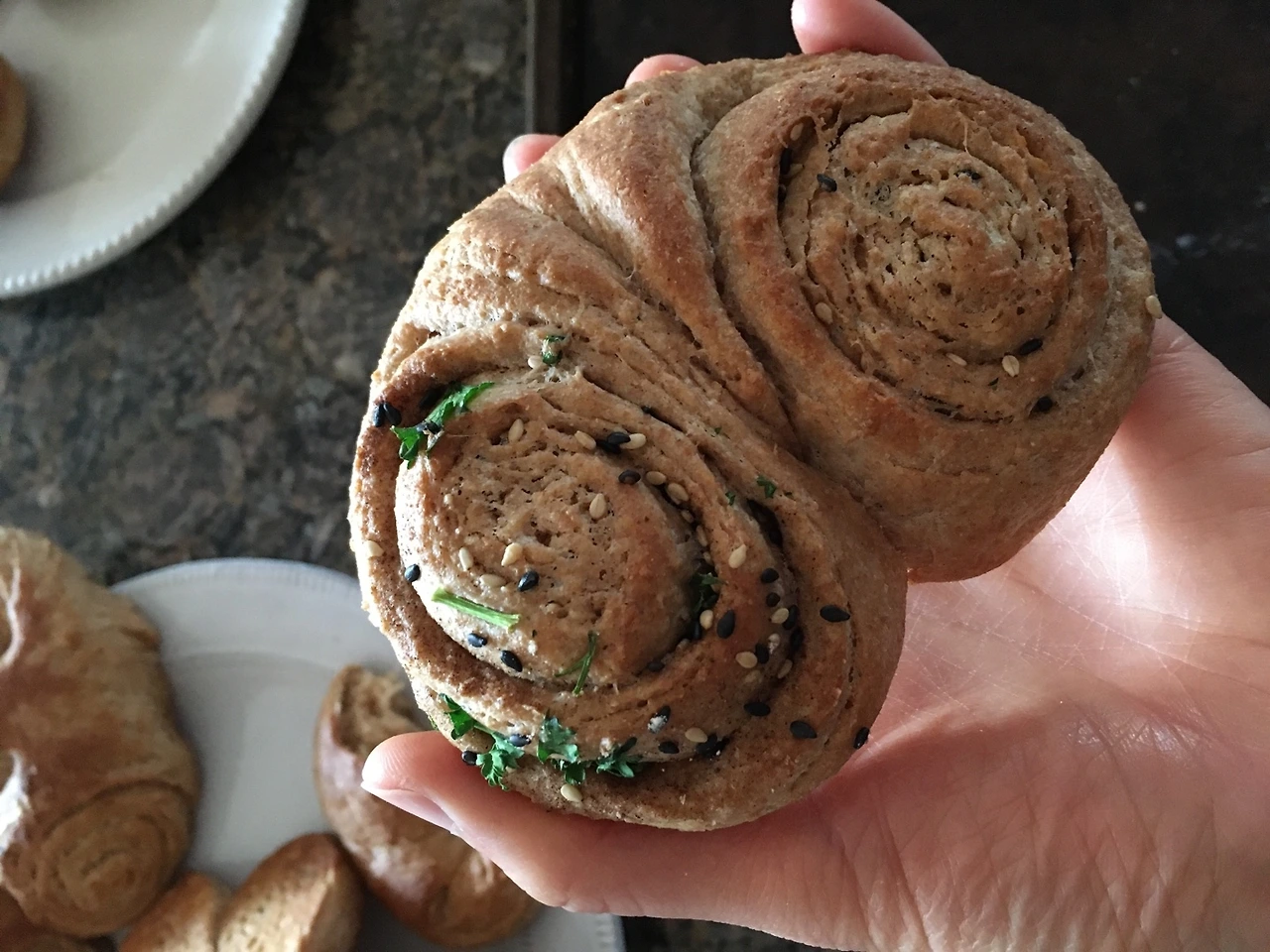 무참히 찢어지는 반죽을 다독여 돌돌 말았다. 뚝뚝 썰어 팬에 올리고 구웠다. 기름진 밀가루떡이 되었지만, 진한 커피에 곁들여 먹을만하다. 실패 이유를 곱씹으면서 다시 새 반죽을 만들어 냉장고에 넣었다. 내일은 성공하길..