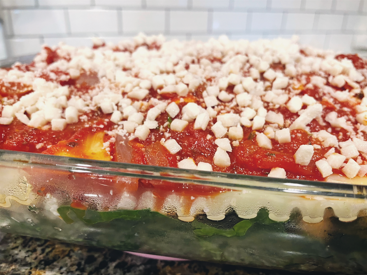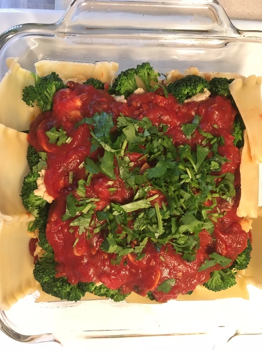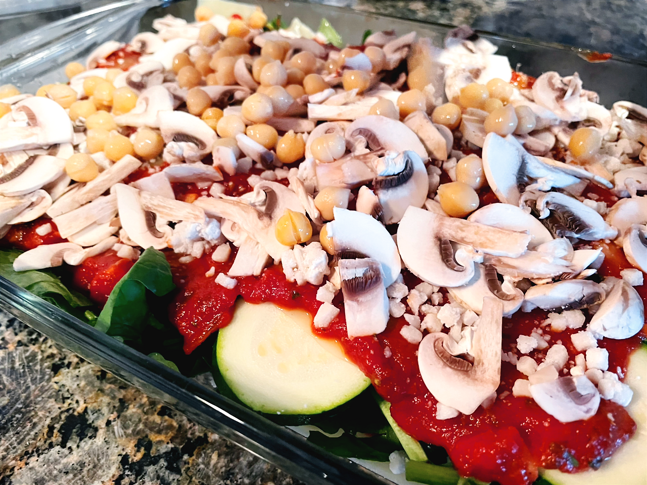 3. 그 위에 토마토소스/애호박/버섯/두부/콩/시금치/케일/치즈를 순서대로 층층이 올린다. 다시 라자냐/소스/채소/두부/치즈를 한 층씩 쌓기를 반복한다. 마지막으로 남은 라자냐/소스/치즈를 올린다.