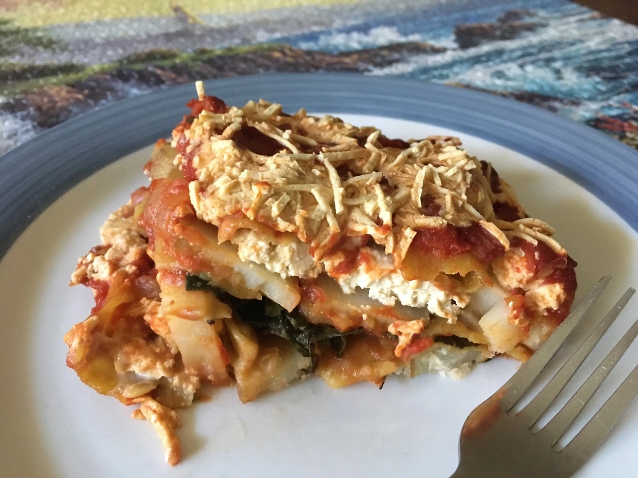 우리가 주로 쓰는 가공식품은 면류, 빵, 콩고기, 토마토 페이스트, 카레 소스 정도이고, 가끔 비건 치즈도 쓴다. 오늘 가장 맛있게 먹은 음식은 남편이 만든 라자냐. 여기에 비건 치즈가 들어간다.