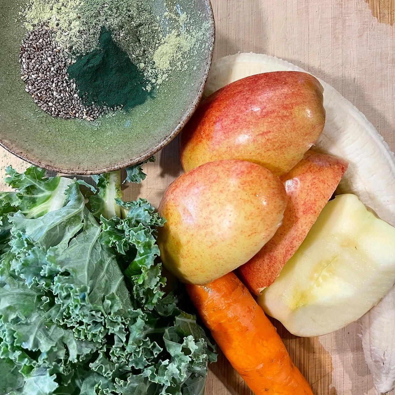 1. 적당히 썬 사과/당근/케일/바나나를 순서대로 믹서에 넣는다.