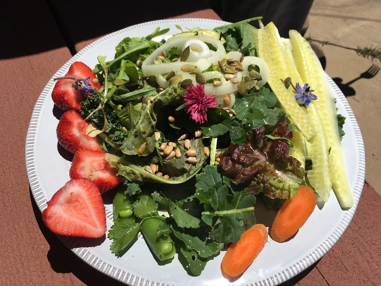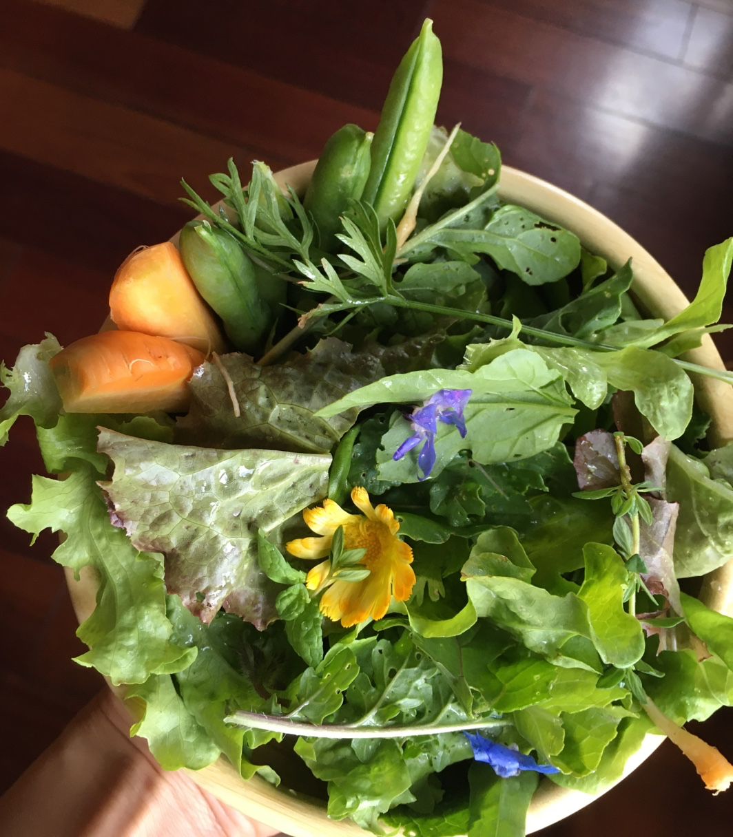 즙이 많은 케일 줄기를 씹고, 아삭아삭 상추 맛을 가늠해 보고, 씹을 때마다 풍기는 당근의 연한 향을 음미한다. 여기에 참깨나 해바라기씨, 호박씨를 섞으면 고소함까지 더해져 샐러드 맛은 더 재밌어진다. 여름이면 텃밭에서 민들레 잎과 아루굴라, 열무, 완두콩, 고수, 파슬리, 바질, 꽃들을 거둬 샐러드를 장식하니 눈도 입도 황홀하다.