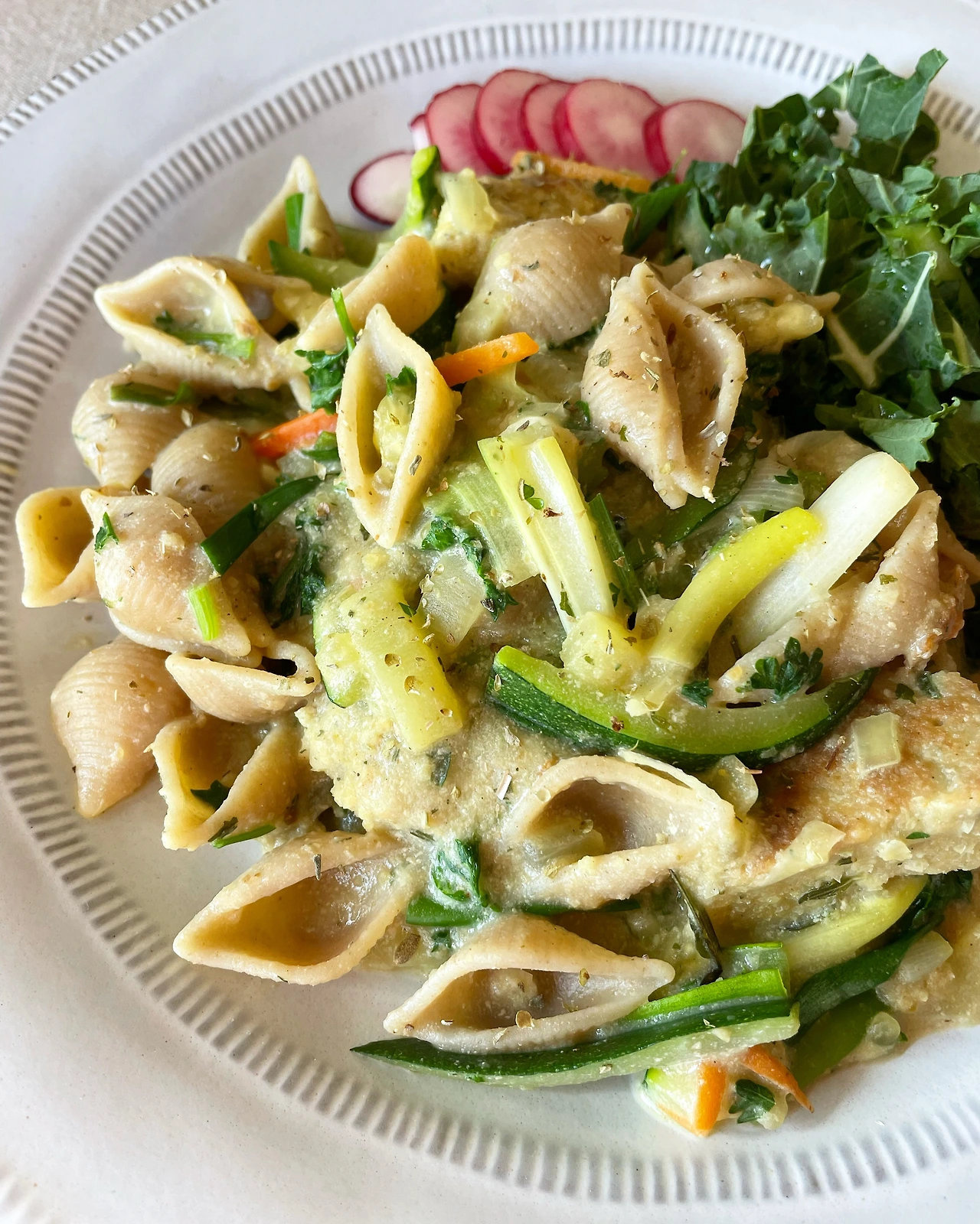5. 재료가 모두 익으면 준비한 파스타를 넣어 섞는다. 후추/허브 잎 등을 뿌려 대접한다.