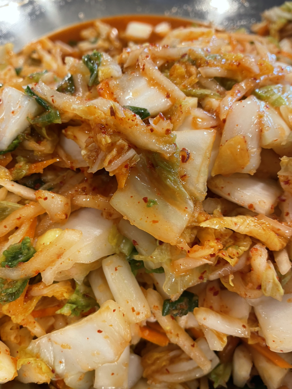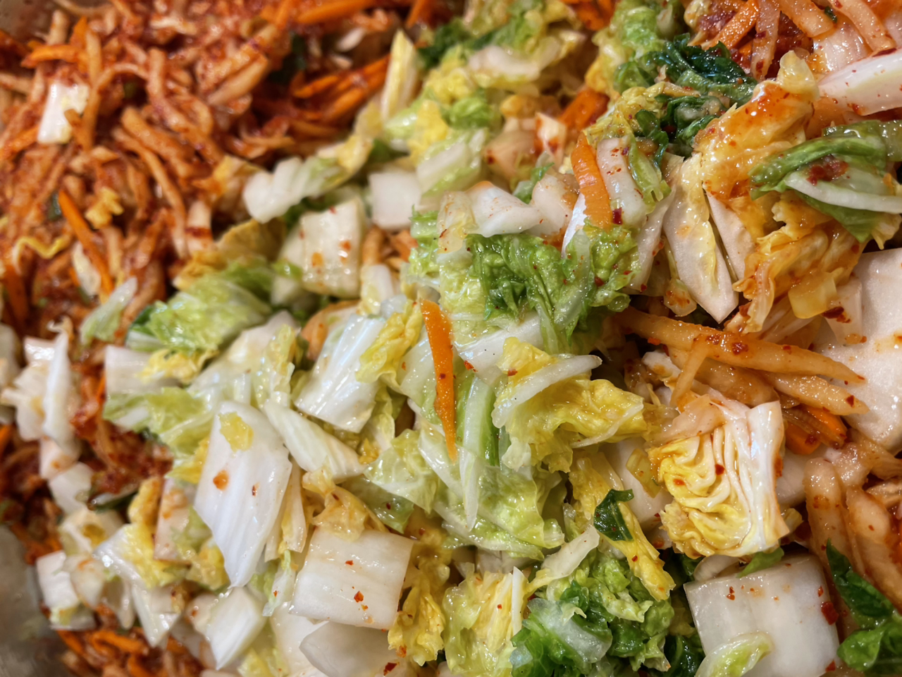 우리 김치는 보통 한국 김치와 조금 다르다. 젓갈과 찹쌀풀이 들어가지 않기 때문이다. 젓갈은 우리가 먹지 않아서 안 넣는다. 내가 먹지 않는 음식을 남에게 권하고 싶진 않다. 그래서 파는 김치도 젓갈 빼고 소금만 쓴다.