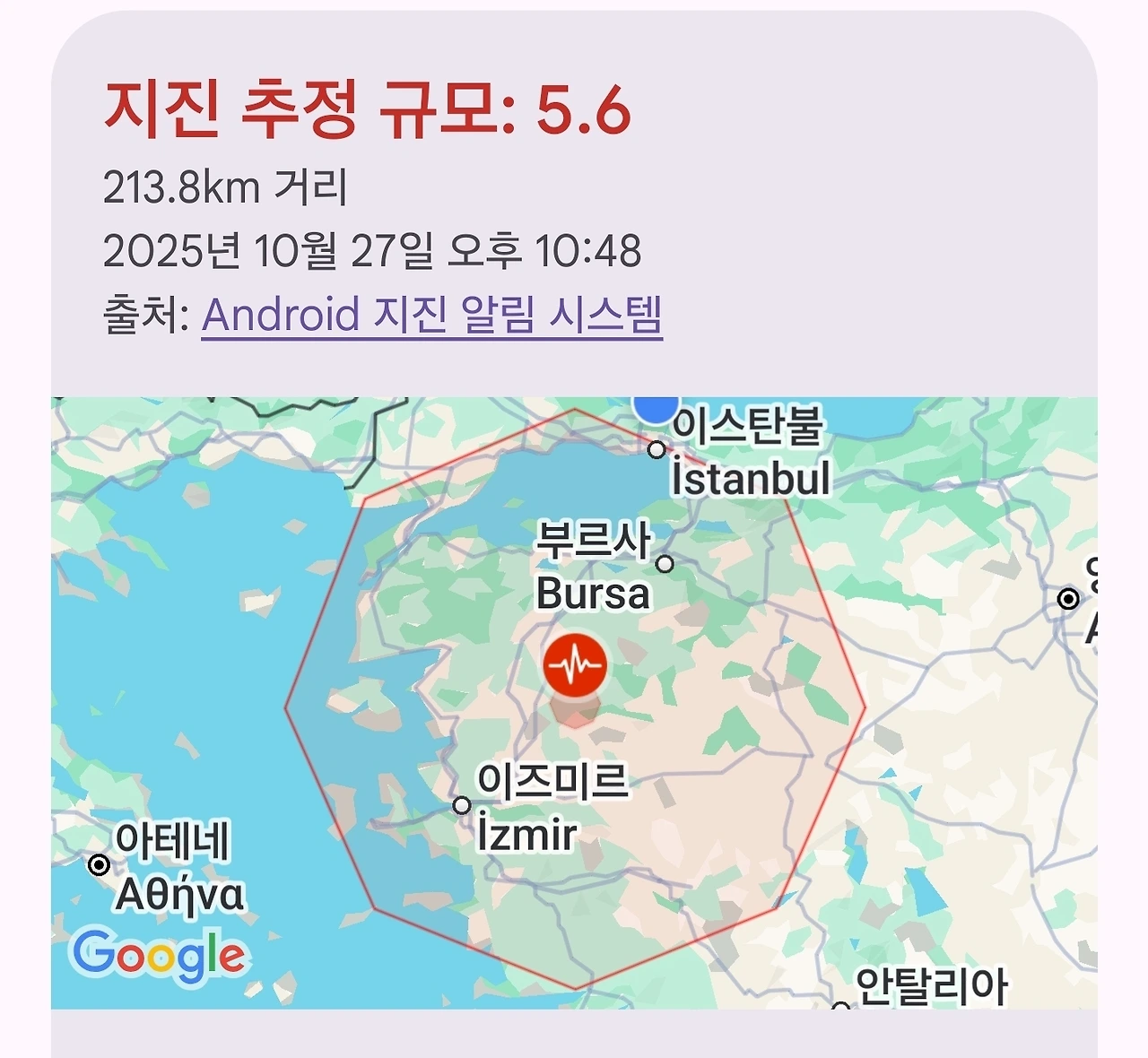 자려고 누웠는데 진동이 울렸다. 구글 알람이었다. 지진이 났단다. 아무 느낌도 없는데? 하고 생각하던 차에 침대가 흔들리기 시작했다. 지진파가 도착하기 전에 알람이 먼저 오는 구글의 민첩함에 솔직히 무척 놀랐다.