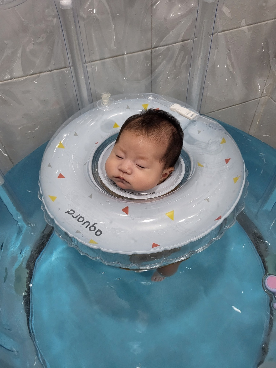 아이가 엄청나게 울 줄 알았는데, 수영을 시켜보니 정말 편안해했다. 첫날에는 울면 어쩌나 조마조마했는데 이게 웬걸 얼마나 편했으면 아이는 수영 중에 잠이 들었다. 수영장에서 아이가 편안해하니 차라리 수영을 좀 시키고 그 물로 목욕을 해보기로 했다. 수영장을 욕조 대신 쓰기로 한 거다. 결과는 대성공. 아이가 몇 번 찡찡대기는 했지만 몸, 머리, 얼굴 순으로 씻겼는데 울지 않았다. 얼굴을 닦을 때도 울지 않은 건 처음이었다.