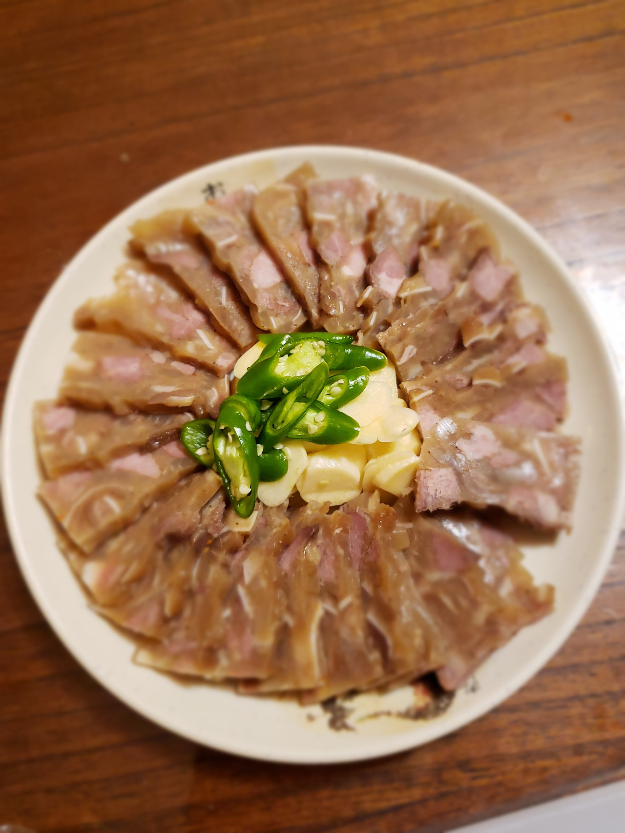 사각 용기에 담아 한 김을 빼고 완전히 식힌 후 냉장실에 넣는다. 돼지껍질을 넉넉히 넣어 젤라틴이 풍부할 것이라 생각돼서 뚜껑 없는 그릇에 대충 담았다. 결과는? 성공적.