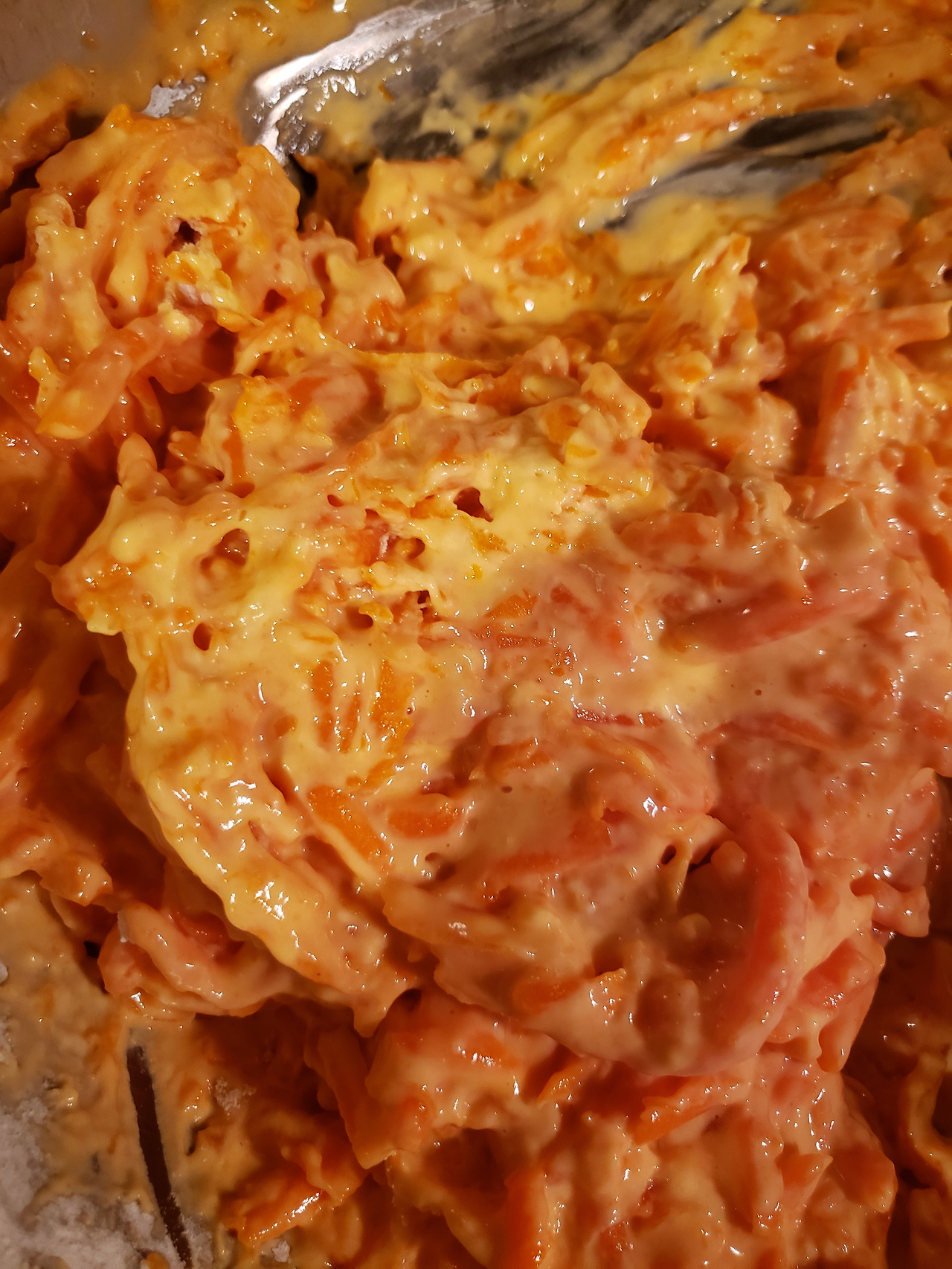3. 호박에서 나온 물이 충분하지 않으면 물을 더 넣고 부침가루를 넣어 반죽을 만든다. 밀가루와 호박이 엉킬정도로 되직하게 하는 것이 중요하다. 호박이 많아야 맛있다.