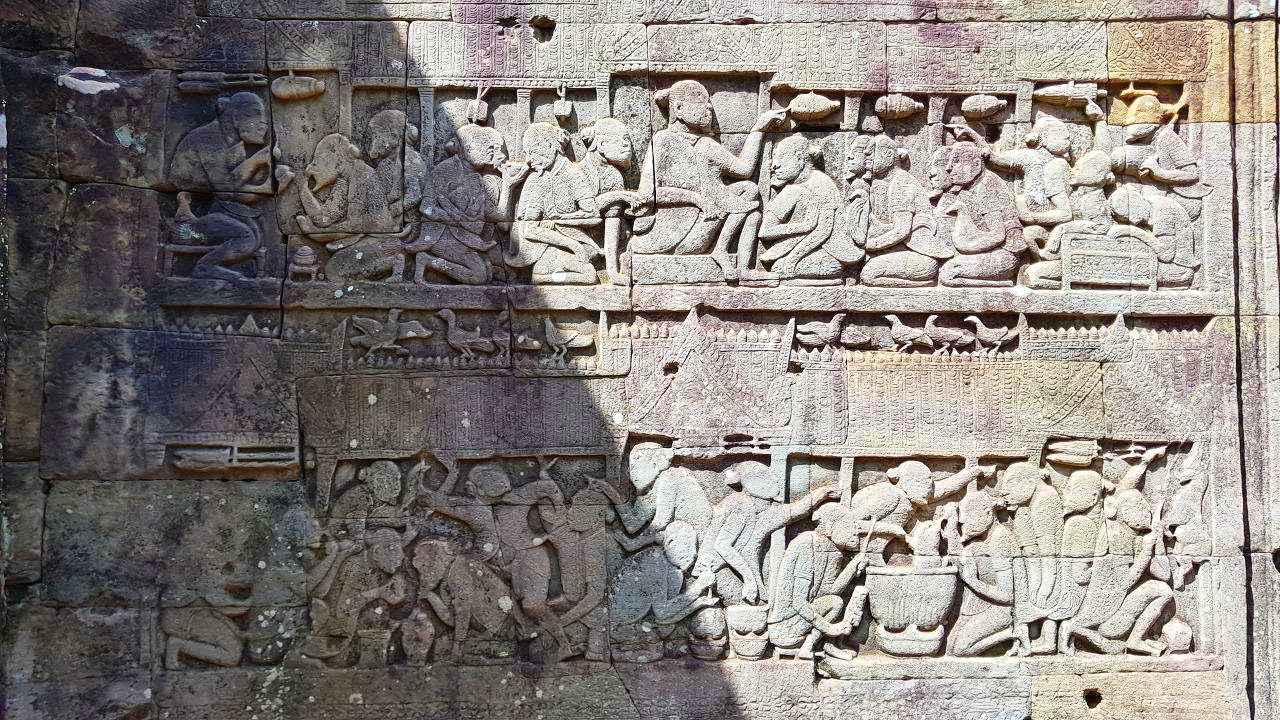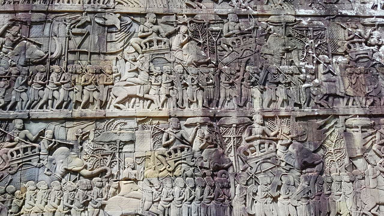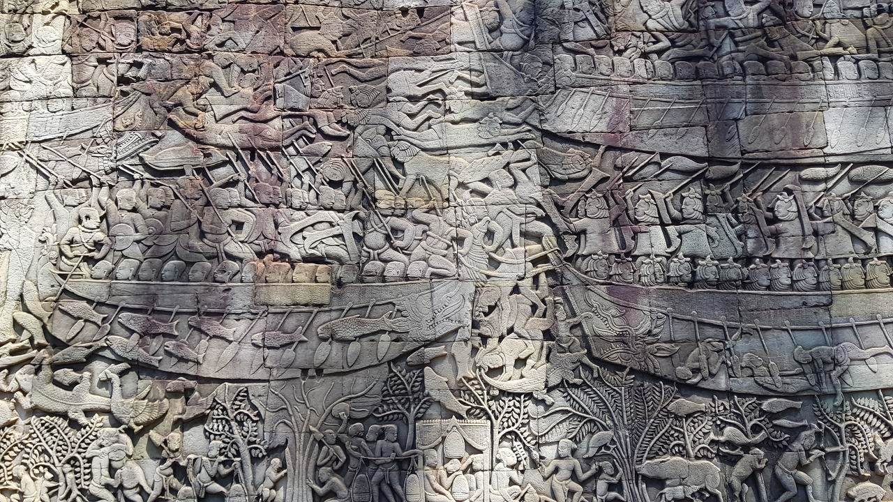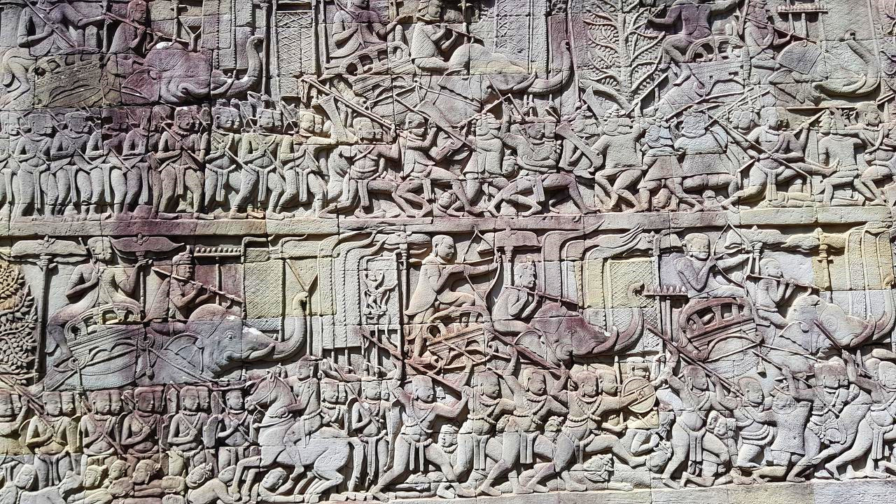 바이욘 사원의 외부 회랑 벽면에는 짬파국을 물리치는 모습과 전투에서 승리한 자야바르만 7세가 행렬하는 모습, 앙코르 제국 역사 상 가장 치열했던 전투라고 칭하는 1177년 돈레삽 해전이 사실적으로 묘사되어 있다.