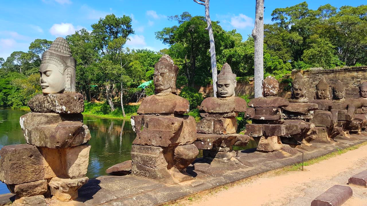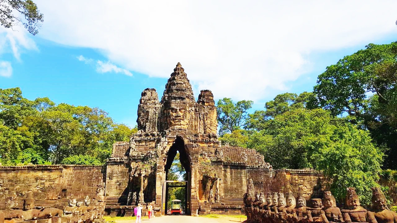 해자를 건너는 다리 난간은 악신과 선신이 줄다리기를 하고 있는데 이것은 앙코르왓 1층 회랑의 부조, ‘우유바다젓기’ 신화를 묘사한 것이다. 100m 해자를 건너면 남문의 자야바르만 7세 얼굴을 만난다. 4 면상이 모두 자야바르만 7세의 얼굴이다. 영락없는 부처의 미소다. 언제나 봐도 미소 짓는 그의 얼굴은 나를 환영한다며 또 한 번 미소 짓고 있다.