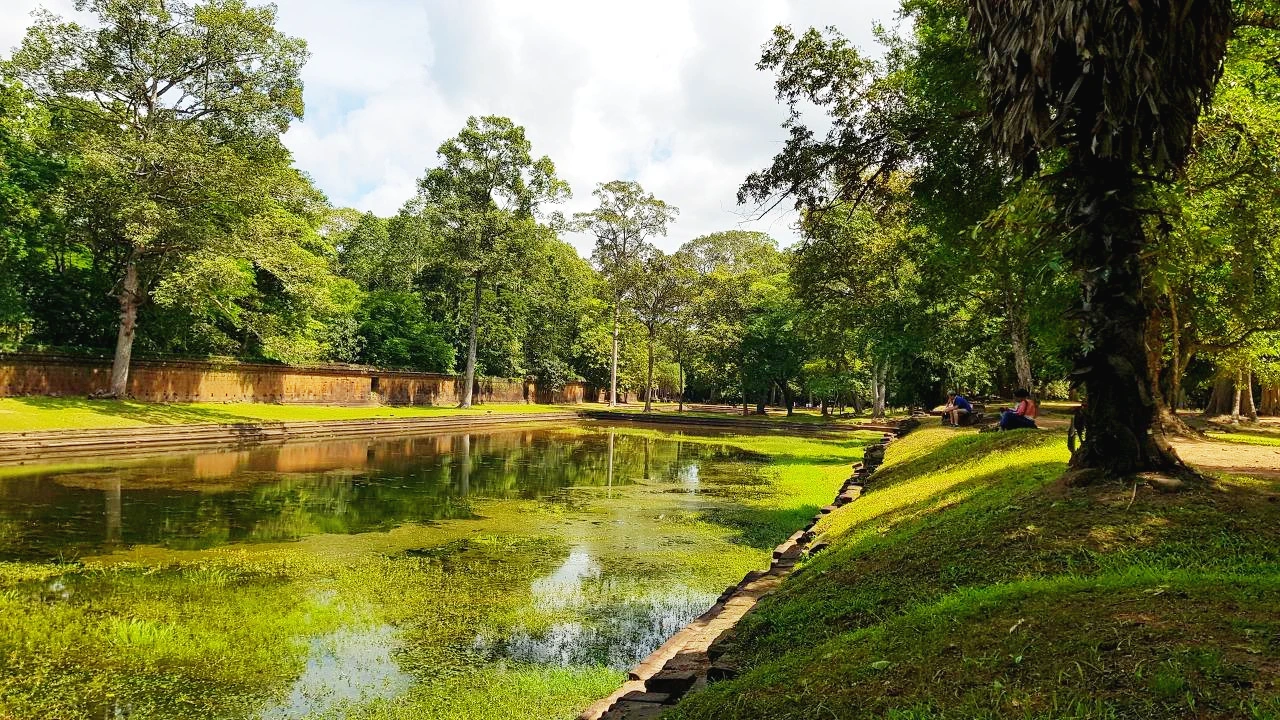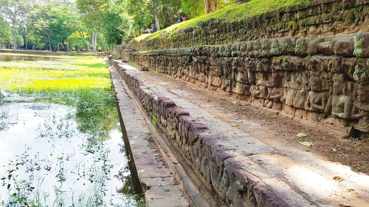 왕궁터는 흔적도 없이 사라졌지만 쓸쓸하게 그 자리를 지키고 있는 것이 있다. 왕궁의 목욕탕이라고 알려진 연못이다. 큰 연못은 정교하게 조각된 석재로 둘러싸여 있다. '주달관'은 왕궁 목욕탕의 모습을 보고 많은 여인들이 한꺼번에 들어가서 목욕을 하는데 왕족의 여인들은 피부가 하얀 반면 시중을 드는 하녀는 까만 피부를 가졌다고 기록했다. 석축 부조에는 이끼가 끼여 있고 물은 탁하다. 과거의 영화가 그저 옛날이야기처럼 들린다. 작은 연못은 신분이 낮은 궁녀들의 목욕탕으로 추정된다. 물이 탁하지만 물이고, 석축 위 큰 나무의 그늘도 있어 나는 한참을 쉬었다. 다시 봐도 연못이 정말 크다. 이곳이 정말 목욕탕이 맞다면 그 당시 왕궁에는 얼마나 많은 사람이 살았다는 말인가?