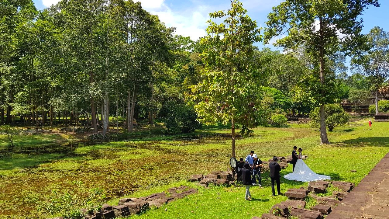 진입로 아래 풀밭에서는 신혼부부의 야외 촬영이 한창이다. 웨딩드레스의 아름다운 곡선과 바푸온 사원의 선율이 뭔가 비슷하다.
