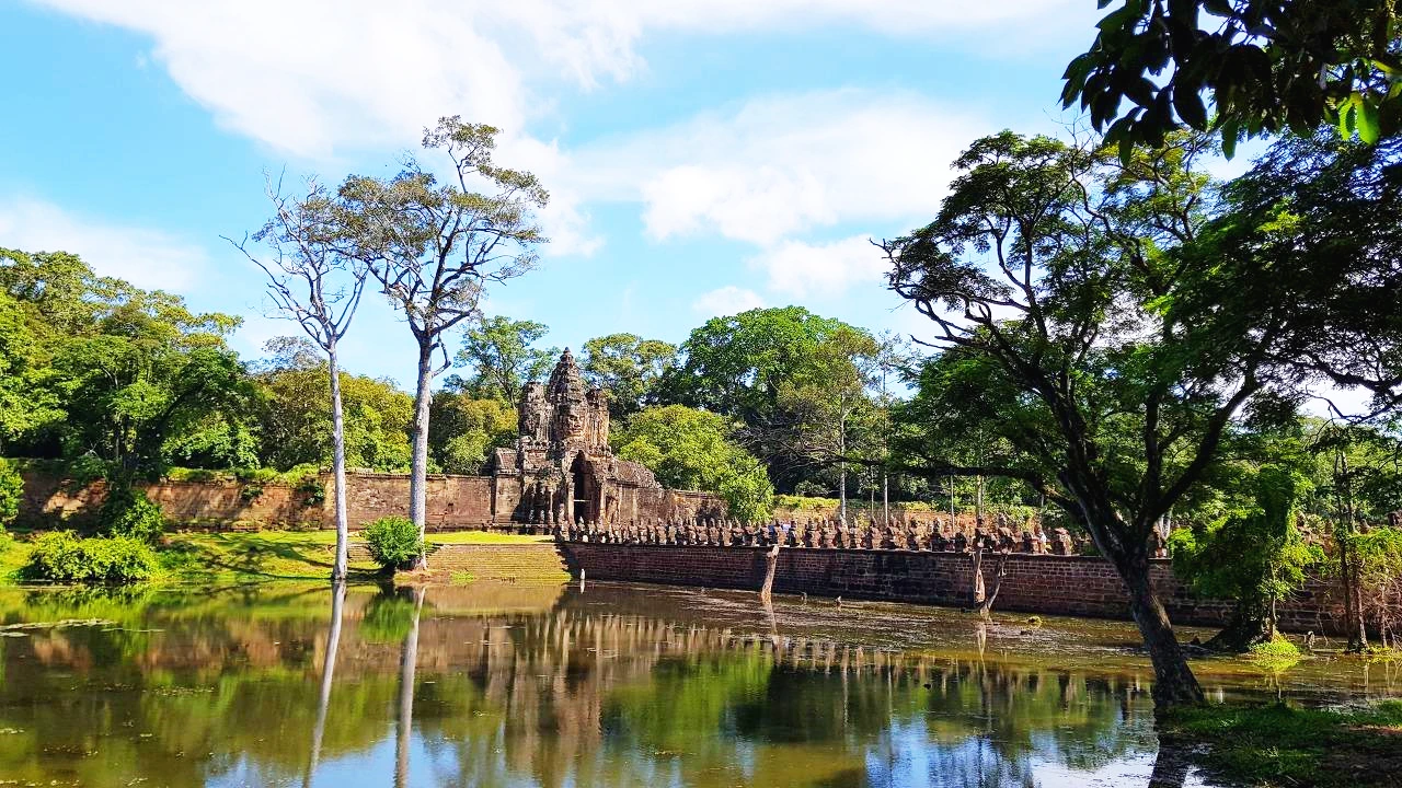 시엠립 앙코르 유적에서 앙코르왓과 함께 가장 유명한 곳이 앙코르톰이다. 앙코르톰은 자야바르만 7세(1181~1215) 시대에 조성된 도시를 말한다. 그 당시 앙코르톰을 중심으로 주변에 70만 명이 살았다니 어마어마하다(그 당시 송나라 수도 개봉은 80만, 고려 개성은 20만, 영국 런던, 프랑스 파리는 채 10만 명이 되지 않았다). 앙코르톰이 건설된 배경은 짬파국의 침략으로 일시적 지배를 받다가 나라를 되찾은 자야바르만 7세가 강한 나라를 만들 필요성을 느꼈기 때문이다. 기존의 도시를 재편하여 적의 침략으로부터 보호하기 위해 3.3km 정사각형의 도성을 8m 높이의 성벽과 폭 100m의 해자로 감싸고 있는 계획도시로 만들었다. 물자 수송을 위해 도로도 새로 깔았다. 자신이 부처라고 믿었던 자야바르만 7세는 백성을 구제하기 위해 102개의 병원도 세운다. 앙코르톰 도시의 생활모습은 원나라 사신 ‘주달관‘이 1296년 이곳에 와서 11개월 체류하며 쓴 ’진랍풍토기‘에 상세히 기록되어 있다.