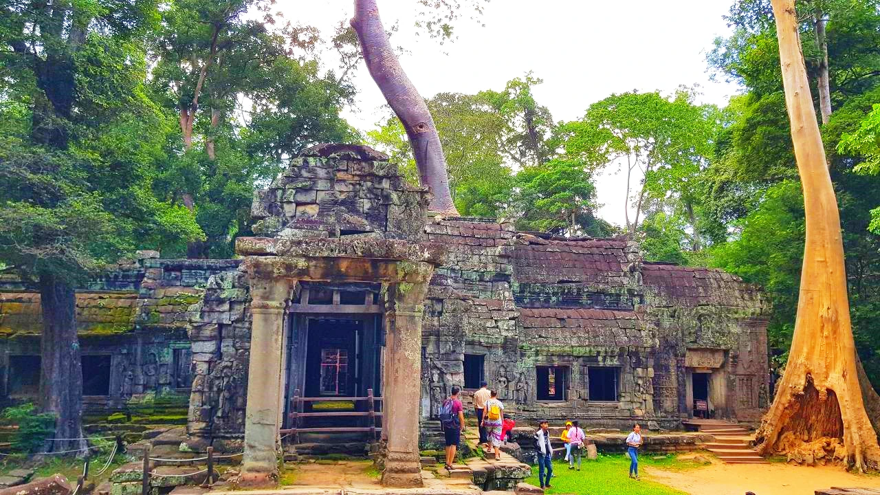 안젤리나 졸리의 영화 '툼레이더'로 더 유명해진 따프롬 사원. 앙코르 유적 중 가장 기억에 남는 곳이 어디냐고 물으면 의외로 따프롬 사원이라고 말하는 사람이 많다. 무엇이 그렇게 강한 인상을 준 걸까? 아마도 폐허의 이미지가 너무나 강열했기 때문이리라. 그 폐허의 주범은 스펑나무다. 따프롬 사원은 프랑스보호국 시절 앙코르 유적 복원계획을 세우며 스펑나무에 의해 붕괴되는 사원의 실제를 연구하며 한 곳은 그대로 두기로 했는데 그 사원이 따프롬 사원이다.