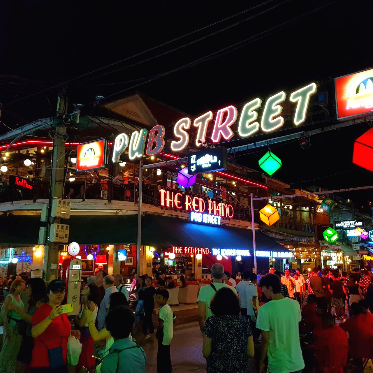 앙코르 유적을 돌아다니다 보면 더위에 힘들고 지쳐 저녁에 그냥 쉬고 싶다. 하지만 저녁에는꼭 팝스트리트에 가야 한다. 팝스트리트는 저녁이 되면 세계인들이 몰려들어 말 그대로 small world가 된다. 조용한 것을 좋아하는 나도 가끔은 팝스트리트에 가서 무리에 끼여 젊음을 느끼곤 한다. 펍에 들어가 맥주도 한잔 하고. 안젤리나 졸리가 들러서 유명해진 ‘레드 피아노’는 매일 사람이 넘쳐난다. 2층에 올라가 팝스트리트를 내려다보면 앉아있는 것만으로도 내가 마치 그녀의 상대 배우가 된 느낌이다. 팝스트리트는 밤이면 너무나 많은 사람들이 쏟아져 나와 정신이 하나도 없다. 하지만 한 번쯤은 그 무리에 섞여 정신 줄을 놓는 것도 좋다. 긴장의 연속에서 살았던 나는 그래서 팝스트리트의 모습을 부러워한다.
