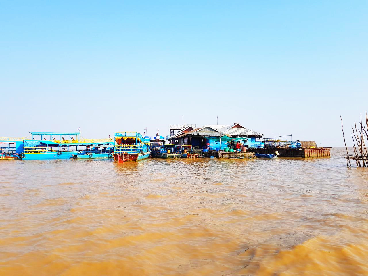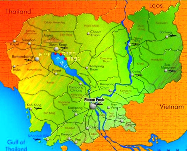 호수 안으로 들어간 배는 석양을 기다리며 정박했다. 배가 정박한 곳 물의 깊이는 5m 정도 된다. 여기에서부터 물길로 14km 떨어져 서쪽으로 쫑크니어 수상마을이 있다. 그곳은 1년 내내 물 위에 떠있는 마을이다. 우기 두 달만 물에 잠기는 껌뽕플럭 마을과는 삶의 환경이 많이 다르다. 마트, 주유소, 병원, 학교 등 모든 시설이 물 위에 떠있다. 전기와 먹는 물은 스스로 해결해야 한다. 쫑크니어 마을을 가는 길은 시엠립에서 남쪽 돈레삽 방향 13km 정도로 가깝다. 그곳 선착장에서 배를 타고 4km 정도 지류를 빠져나오면 돈레삽 호수에 이른다. 이 마을은 건기나 우기 언제나 변함없이 물 위에 늘 같은 모습이다. 작년 쫑크니어 수상마을에 갔던 기억이 새롭다.