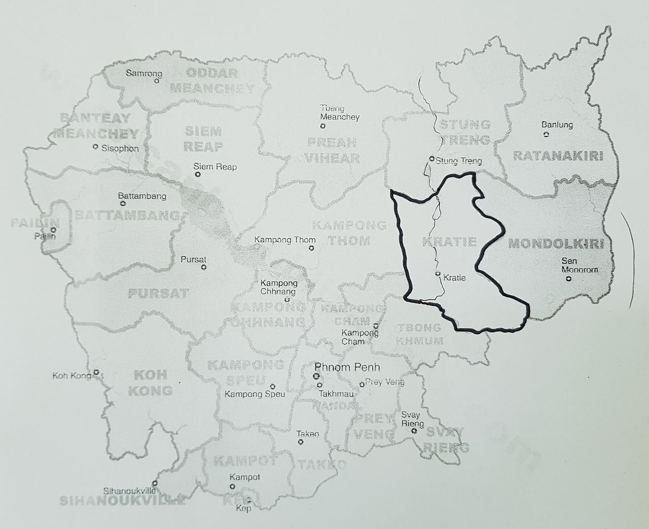 라오스에서 스텅뜨라엥을 거친 메콩강은 다시 아래로 흘러 끄러쩨로 이어진다. 끄러쩨의 메콩강에서는 돌고래를 만날 수 있고 고운 모래사장이 있는 강 건너편 섬에서는 많은 사람들이 수영을 즐긴다. 메콩강을 끼고 아래로 일직선으로 이어진 끄러쩨는 강변에 늘어선 호텔과 게스트하우스가 많아 숙소를 걱정할 필요가 없다. 강이 보이는 게스트하우스는 전경이 환상적이다. 메콩강이 한눈에 내려다보인다.
