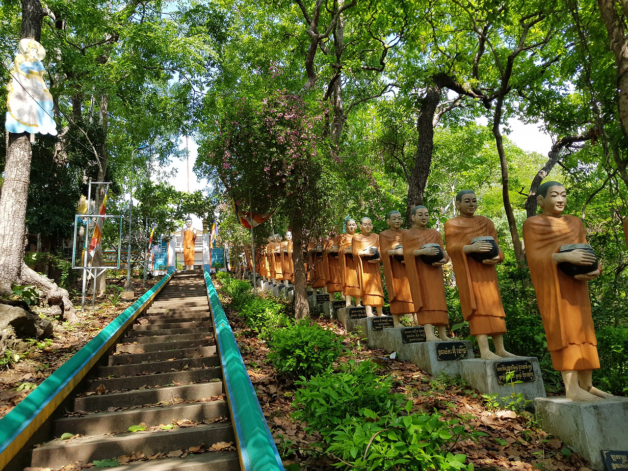 프놈썸복 사원은 그다지 높지 않은 산에 있는 사원이다. 사원 입구에 거인 동상 두 명이 입구를 지키고 있다. 먼 데서 온 여행객을 반기는 듯 순한 표정이다. 사원을 오르는 계단 옆에는 공양 그릇을 든 부처상이 늘어서 있다. 공양 그릇을 ’발우’라고 하는데 캄보디아 말로 ‘받록‘이니 비슷하다. 프놈썸복이라는 이름은 오래전 이곳 산에서 금이 나왔다고 해서 붙여진 이름이라고 한다. 그래서 그런지 금색을 입힌 불상이 많다. 산 중턱에 큰 사원이 있고 다시 계단을 올라 꼭대기에 작은 사원이 있다. 헐떡거리며 계단을 올라 산 중턱에 있는 사원 입구에 도착하니 ’악을 행하지 말고 선을 행하라. 이것이 부처의 가르침이다‘라고 쓰여 있다. 나는 사원 중앙에 서 있는 큰 불상을 보며 그 말을 되새겨 봤다. 선을 행하지는 못했지만 악을 행하진 않았으니 그나마 다행이라고 스스로를 위로했다.