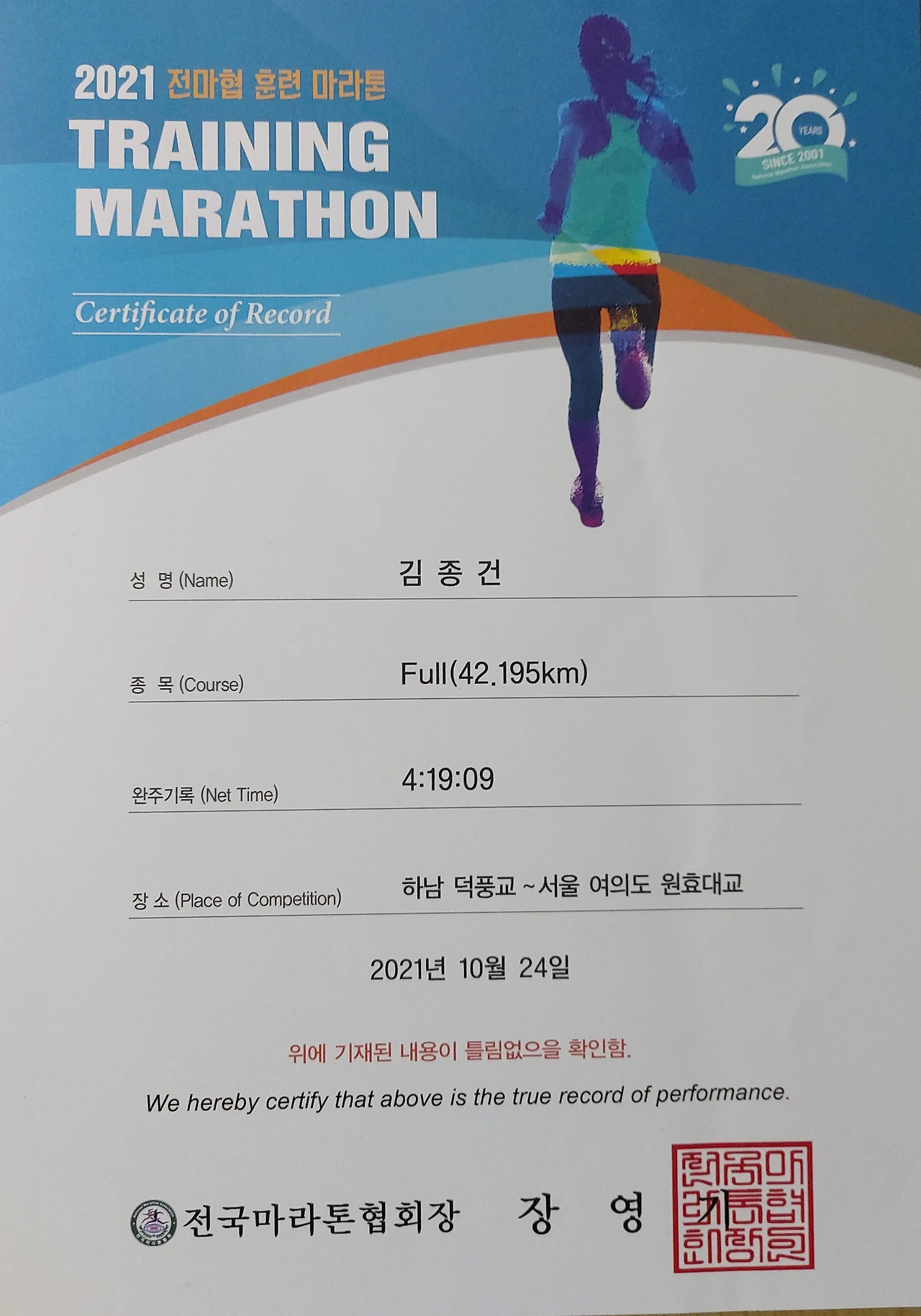 마라톤을 시작한 지 10년, 상하이 마라톤대회 참가가 첫 번째 대회였다(그 당시 나는 중국 상하이에서 근무하고 있었다). 오래된 기록증을 뒤져보니 감회가 새롭다. 2017년 2월 참가했던 서울레이스챔피언쉽대회 3시간 57분의 기록이 나의 최고 기록이다. 2016년 7월 내 고향 대천해수욕장에서 개최되었던 보령머드임해마라톤 기록증도 보인다. 그때 기록은 4시간 44분, 한여름 무더위에 쓰러지지 않은 게 다행일 정도로 많은 사람이 기권했던 대회였다. 2018년 코이카 해외봉사단으로 캄보디아로 가며 한국기록증은 더 이상 없다. 그리고 코로나로 인해 2년째 마라톤 대회도 자취를 감췄다.