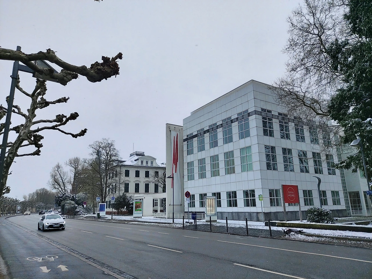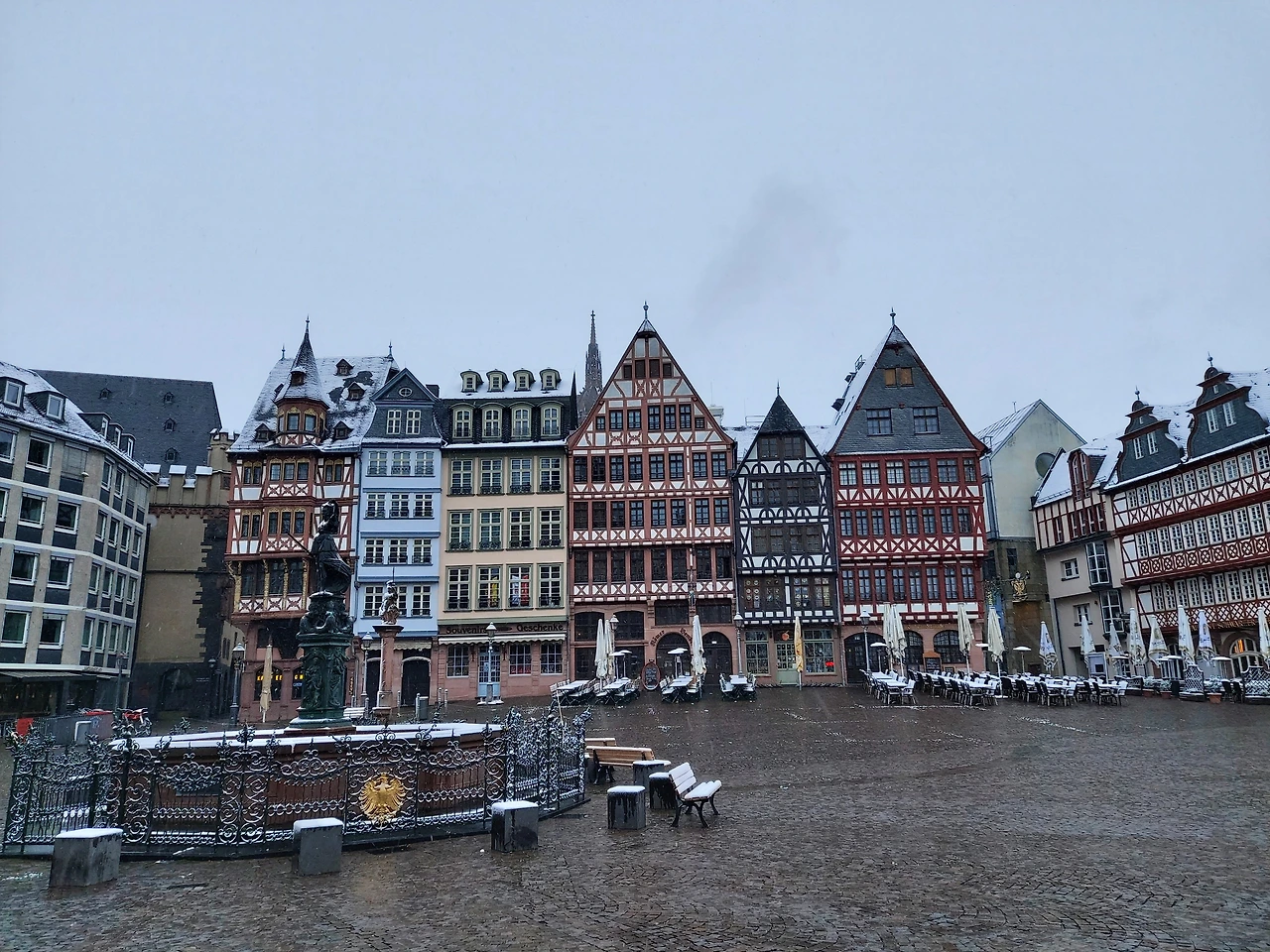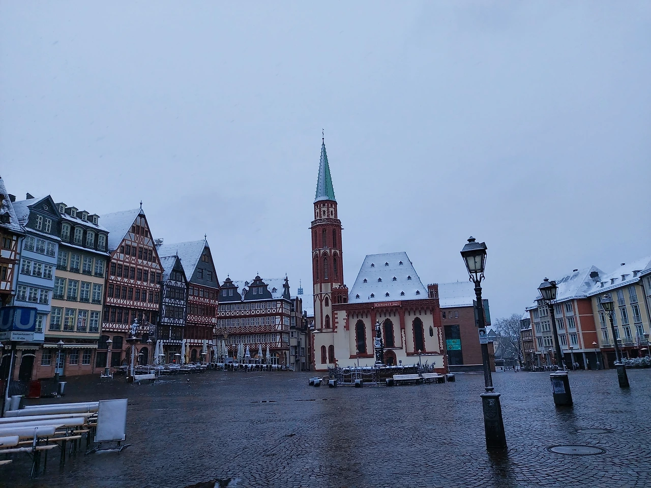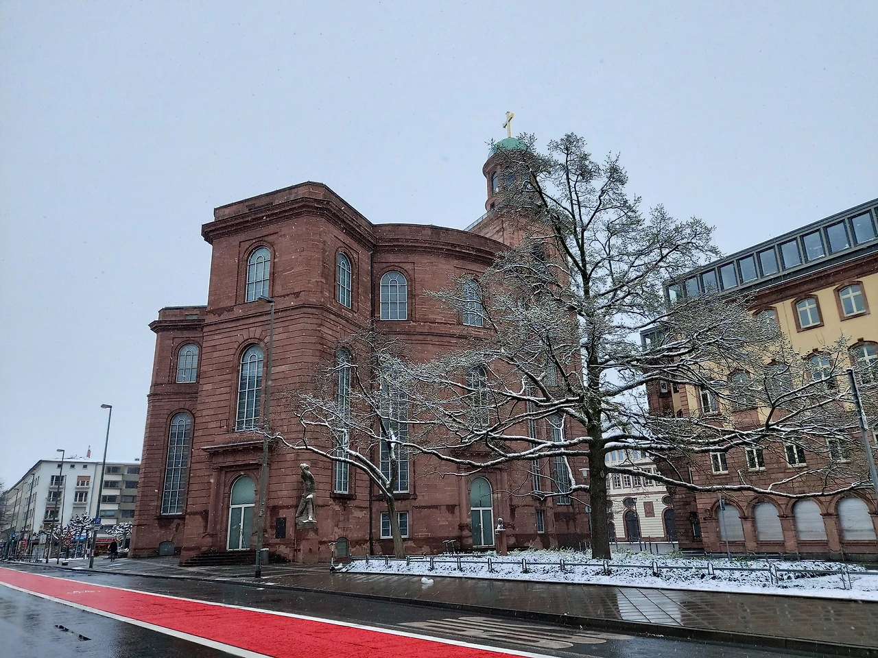 뢰머광장 가는 길은 오래된 독일의 모습을 그대로 느낄 수 있어 이리저리 눈을 호강하며 달렸다.1848년 지었다는 파울 교회의 적벽돌은 단순한 듯 위엄을 느끼기에 충분했다. 갑자기 내린 아침 눈으로 하얀 옷을 입은 고목이 조화를 이뤄 아름다움이 더했다.