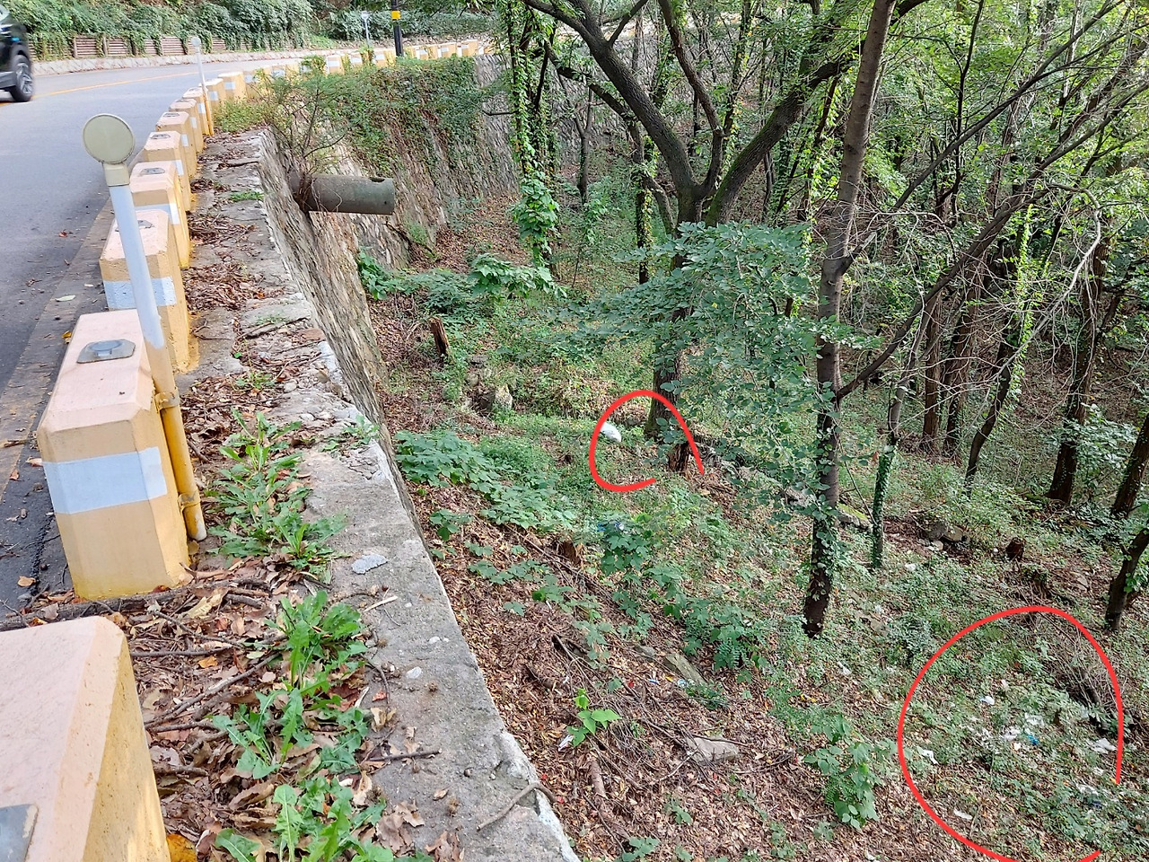 달리다 서다를 반복하며 쓰레기를 줍다 보니 달린다는 느낌이 안 들었다. 그래도 달려야 하기에 쓰레기 없는 구간에서 종량제 봉투를 메고 빠르게 달렸다. 산성역에서 남한산성 행궁까지는 5.5km. 길가 쓰레기는 산성역에서 4km 구간에 많다. 길가의 쓰레기는 주웠지만 길가 낭떠러지 밑의 쓰레기는 주울 수가 없다. 어떻게, 누가 버렸는지 줍기도 힘든 낭떠러지 산에 정말 쓰레기가 많다. 차를 타고 가다 차창 밖으로 던져 버린 거 같은데 이런 사람들이 많다는 것에 새삼 놀랍다. 주울 수는 없고 안타깝게 쓰레기를 쳐다만 보며 지나쳤다.