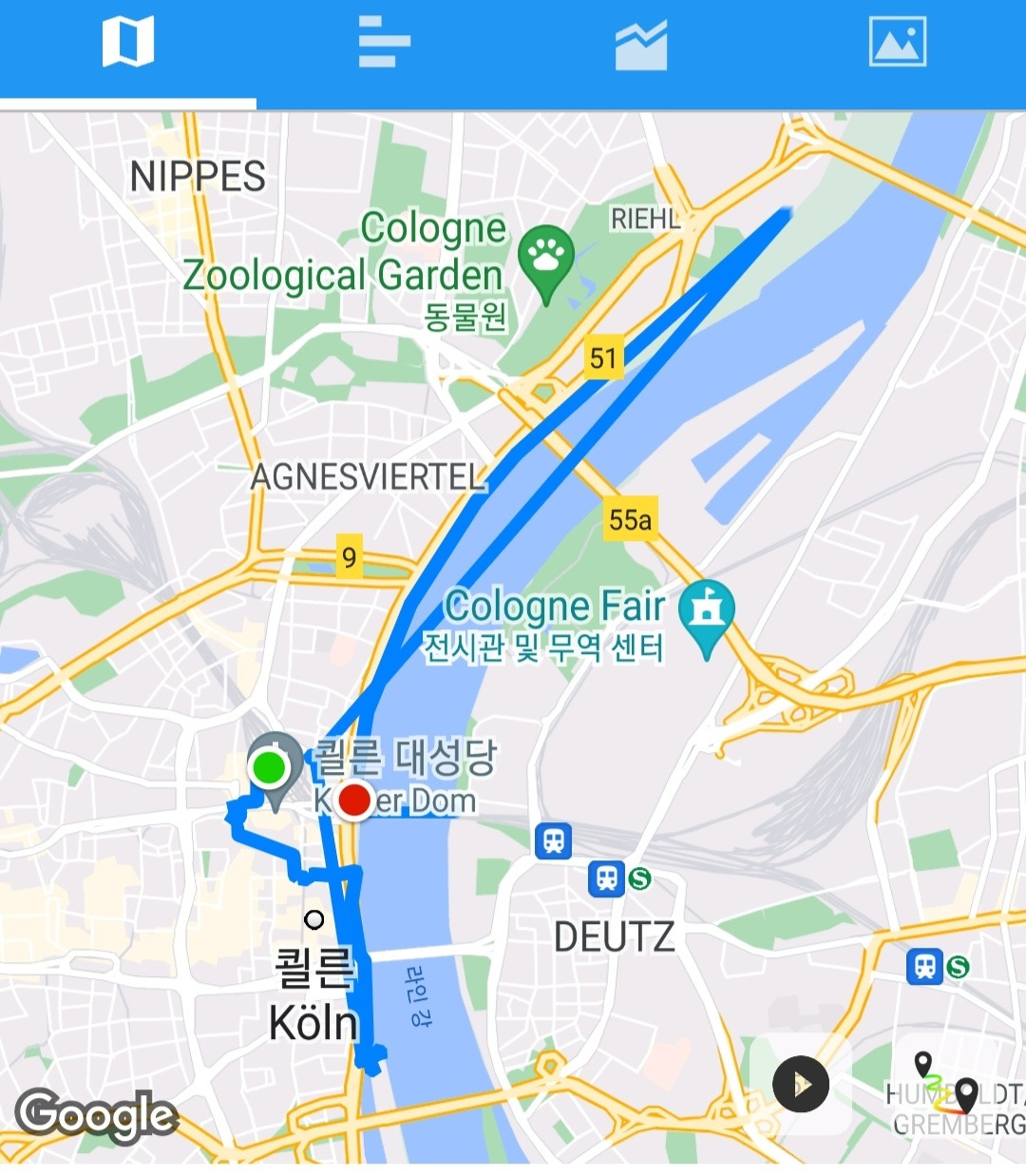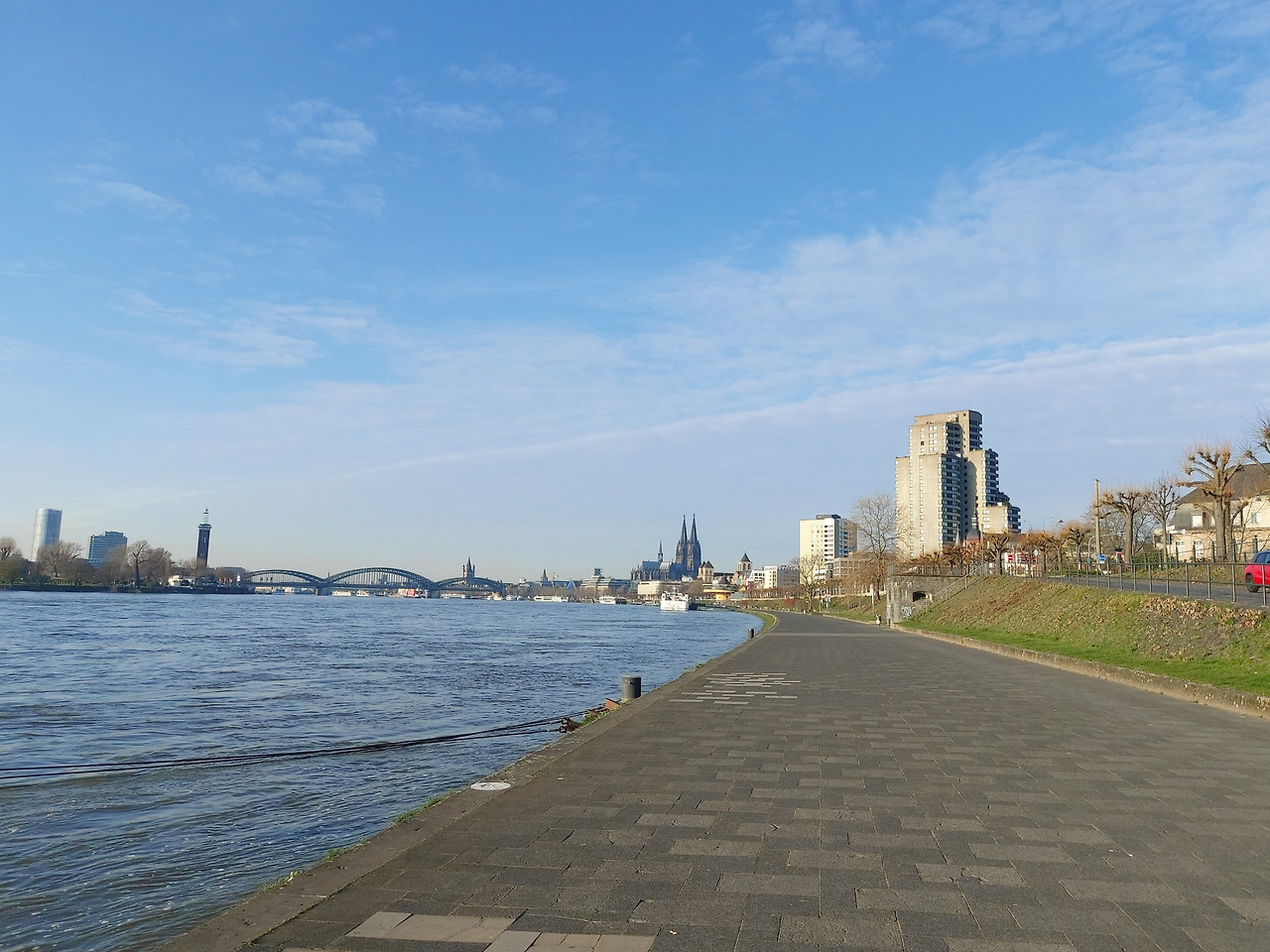여기서 턴해 뮐하임 다리 방향으로 달렸다. 강변을 따라 계속 달리는 길이다. 마치 한강변을 달리는 기분이다. 머릿속은 한강이 눈에는 라인강이. 두 개의 강을 즐기며 달렸다. 이국적 경치에 취해 빨리 달려도 지치지 않는다. 그만큼 라인강변은 달리기에 최적의 코스다.
