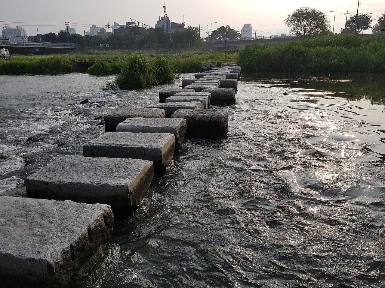 너무 늦은 시간에 친구 집에 들어가는 것도 결례인 거 같아 나는 빠른 걸음으로 걷기 시작했다. 오창읍을 통과하여 청주 시내로 진입해서는 좀 더 빠르게 걸었다. 대략 시간당 4~5km 속도로. 미호천을 건너면 청주시 중심가로 진입하게 된다. 나는 팔달교를 지나 청주대학교 방향으로 걸었다. 곧 만나게 될 친구를 생각하니 걸음걸이가 그냥 급해졌다. 10여 km를 이렇게 걸으며 청주 시내 깊숙이 들어왔다. 청주는 그전에도 몇 번 와봤기에 섧지는 않았다. 무엇보다도 시내 중심가에 높은 빌딩이 없는 게 좋았다. 하지만 지금은 많이 변했고 시내 중심가를 감싸고는 고층아파트가 우후죽순으로 생겨나 예전의 도시미관은 간데없다. 나는 충북도청에서 우측으로 돌아 무심천으로 향했다. 이곳은 출발지 광혜원 면내으로부터 45km 지점이다. 오창읍을 지나면서 피로감이 있었으나 곧 친구와 만날 거라는 기대감에 견딜만했다. 하지만 두 다리가 무겁고 특히 왼쪽 발목이 시큰거리는 느낌은 은근히 내일을 걱정하게 만들었다. 어쨌든 어제에 이어 꽤나 먼 거리였던 오늘도 어느덧 8.6km만 남겨 놨다. 좋은 날씨와 쾌적한 시골길 도로는 어제 오전 빗속의 악천후와는 달리 기분 좋게 걷는 하루를 만들어주었다. 게다가 오늘 저녁을 친구와 함께 한다니 발걸음이 어찌 무겁게만 느껴지겠는가? 친구는 이미 30분 전에 무심천에 도착해서 나를 기다리고 있었다. 가끔은 보던 친구였지만 이런 행색으로 나를 보니 더 정겨웠나 보다. 친구가 배낭을 낚아채 대신 멨다. 그제야 나는 배낭의 무게가 느껴졌다. 어깨가 날아갈 듯 가벼웠다. 45km 내내 느끼지 못했던 배낭 무게를 벗고 나서야 느끼다니. 역시 자신을 극한으로 내모는 정신력이 중요했다. 시간은 어느덧 저녁 6시 41분, 무심천엔 어둠이 깔리기 시작했고 저녁 산보 나온 사람들도 많이 보였다. 친구와 나는 사람들 사이에 묻혀 이런 얘기 저런 얘기를 발걸음에 담으며 집으로 향했다.