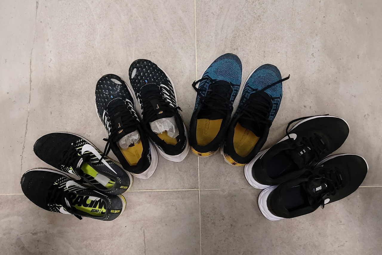4개의 런닝화. 다 사연이 있다. 가격도 천차만별. 30만 원짜리도 있고 8만 원짜리(맨 우측 그냥 운동화-트래드밀에서 뛸 때 신는다)도 있다. 가운데 두 개는 밑창이 닳았는데 버리지 않고 그냥 신고 달린다. 밑창이 닳았다고 기록이 나빠진다고는 생각지 않기 때문이다. 닳은 밑창에는 오히려 더 많은 사연이 있다. 닳아 빠진 밑창은 땀의 대가다. 도전의 결과다. 신발에 얽힌 여러 사연이 그저 대견할 뿐이다.