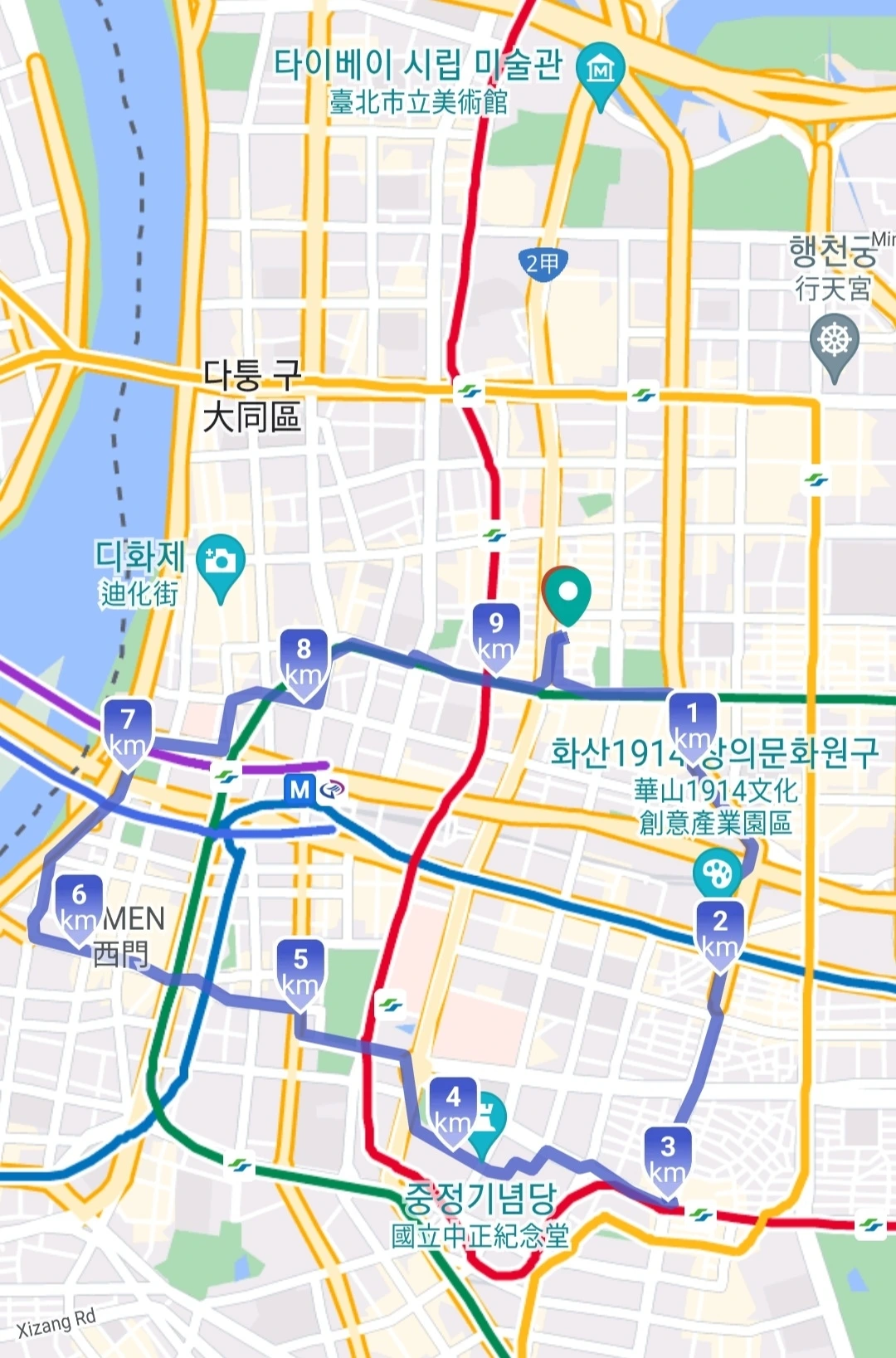 사실 오후 갑자기 뛰러 나오게 된 건 강가를 달리고 싶어서였다. (타이베이는 단수강이 시내 중심을 가로질러 흐르고 있다. 여행 오기 전 타이베이 달리기 계획을 세우며 단수강변을 한강변의 모습으로 생각했다. 하지만 단수강변은 강변을 한강변처럼 꾸민 공간도 극히 일부분일 뿐만 아니라 걸어서 강변으로 진입하는 길조차 찾기 어려웠다). 구글 지도를 보며 강변 방향으로 계속 뛰었다. 타이베이의 명동이라는 시먼딩을 지났다.
