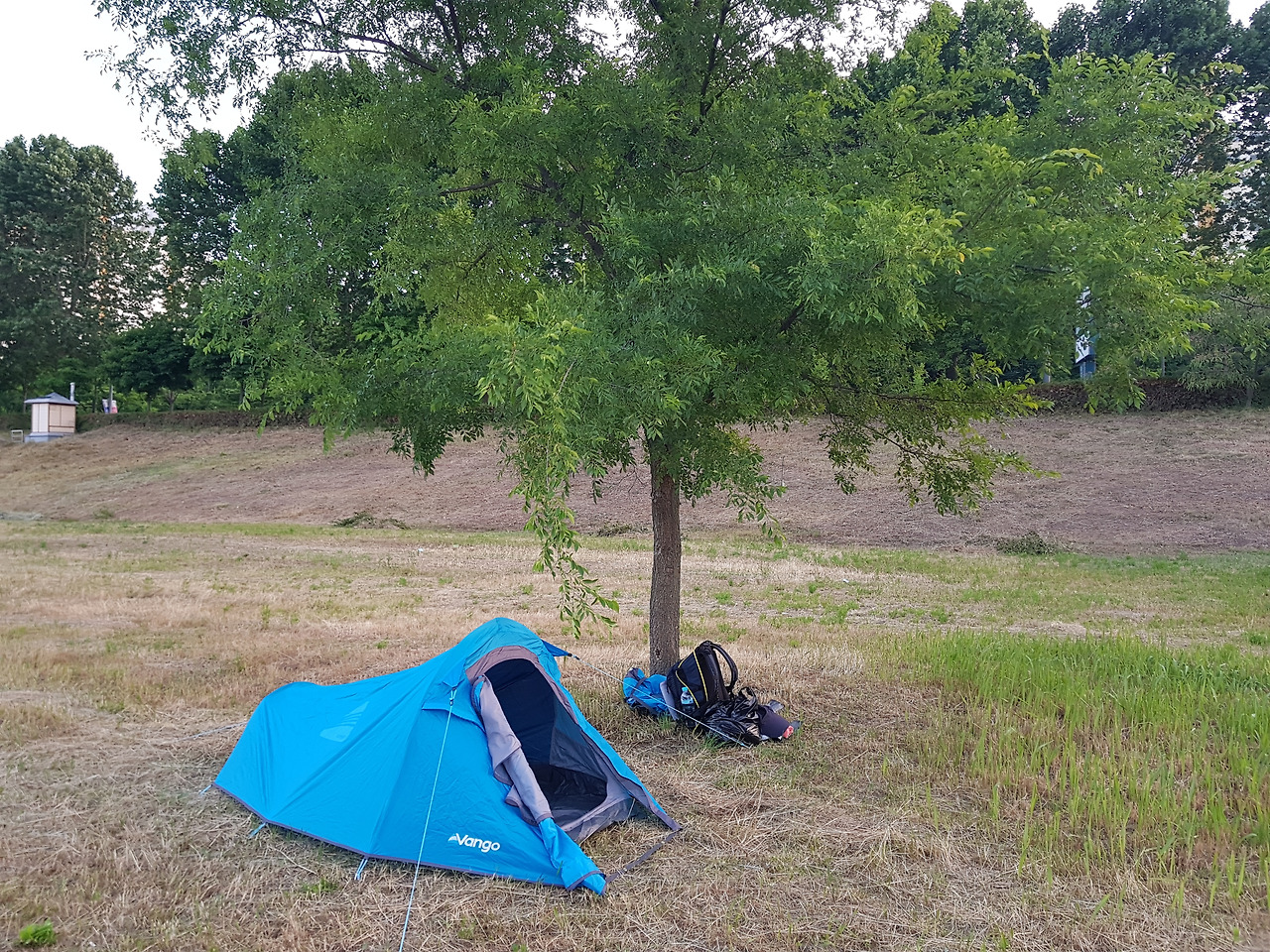 둔산대교 밑의 갑천공원은 수많은 사람들이 금요일 저녁시간을 즐기기 위해 나와 있었다. 산보하는 사람들, 운동하는 사람들, 데이트하는 사람들.. 그렇게 사람이 많은 곳은 나만의 시간이 훼방 받는 것 같아 나는 좌측으로 1.5km 더 걸어 공원 한적한 곳에 짐을 풀었다. 나만의 안락한 휴식을 위해서 어쩔 수 없이 힘든 몸을 이끌고 1.5km를 더 걸었는데 그나마 내일 걸을 방향과 같은 방향이었다. 텐트를 치고 야영 준비를 마치니 저녁 6시 반, 43km를 4.0/1h(쉬는 시간 제외)로 걸어서 6일 차 도보를 힘들게 마무리했다.