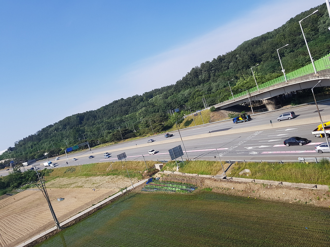 대전시를 관통하여 흐르는 갑천으로 들어가기 위해 나는 17번 국도를 따라 대전 방향으로 걸어 내려갔다. 근데 이 도로는 보행로는 있으나 도로 좌우에 가게나 집도 없고 보행하는 사람도 거의 없다. 도로 갓길이 있고 검색해 보니 이 길이 갑천으로 가는 직선도로 기에 나는 계속 앞으로 걸어갔다. 한참을 걸어 나는 결국 경부고속도로를 밑에 두고 걸쳐져 있는 고가를 걷는 꼴이 되었다. 17번 국도는 이렇게 연결되어 차들은 이 고가를 지나 경상도 방향이다 전라도 방향이다 이곳저곳으로 잘도 달리는데 내가 딛고 있는 이곳 고가도로에서부터는 도로 갓길도 없었다. 분명 나는 17번 국도라고 한길로만 계속 걸어온 거 같은데 귀신이 곡할 노릇이었다. 오도 가도 못하는 상황이라 조심스럽게 앞으로 걸으며 빠져나갈 길이 있는지 살펴보았다. 고가 밑으로는 여전히 경부고속도로 상하행선 차들이 쌩쌩 달리고 있었다. 나처럼 걸어서 이곳에 서있을 사람은 앞으로도 영원히 없을 그런 길이었다. 위험하지만 기념으로 고가도로 중앙에서 아래쪽 경부고속도로 사진을 재빨리 한 장 찍고 멀리 보이는 갑천을 보면서 조심스럽게 걸었다.