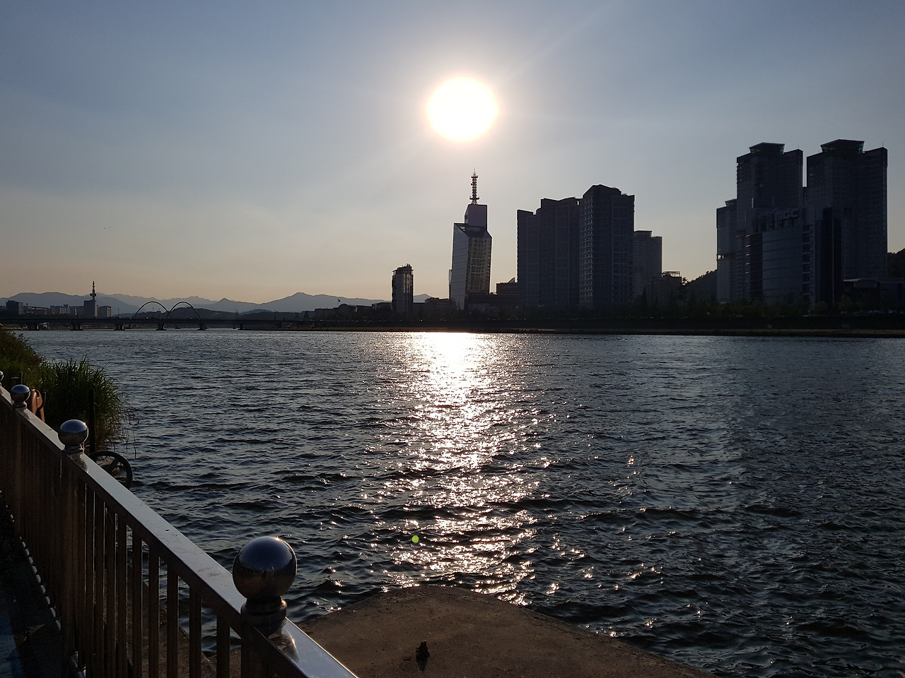도보여행자는 몸의 신호를 잘 읽을 줄 알아야 한다. 어떤 땐 하루 50km를 걸어도 거뜬한데 어떤 땐 20km에서도 피로감을 느끼기도 한다. 이런 땐 자만하지 말고 신체의 신호를 따라야 한다. 마라톤에서 32~35km 지점을 지날 때는 신체의 탄수화물 에너지원이 고갈되기 시작하며 지방을 분해해서 근육에 에너지를 공급하는데 이때 신체 내의 밑바닥을 긁어내는 듯한 고통이 온다. 그게 경련으로 나타나는 것은 탄수화물이 고갈되어 지방을 분해하면서 발생하는 신체적 반응이고. 지금 내 몸의 상태가 몸속 마지막 남은 에너지를 긁어내면서 걷는다는 느낌이었다. 신체의 경고음을 무시하고 걷다가 더 큰 문제를 만날 수도 있는데.. 지금 나는 쉬어야 했다. 1,000km 국토종횡단에서 나의 신체를 돌볼 사람은 오직 나 한 사람일 뿐이다. 하지만 나는 또 걸었다. 아니 목적지까지는 걸어야 했다. 갑천 원촌교 교각 밑까지 걸어서는 나는 거의 탈진 상태가 되었다. 다리만이 아닌 온몸이 쑤셨다. 왼쪽 발목을 신경 쓰며 자연스러운 보행을 하지 않고 짝 다리 발 디딤을 한 것이 피로를 가중시킨 듯 했다. 갑자기 배낭을 벗어던지고 싶어졌다. 나는 교각 밑 벤치에 앉아 배낭을 벗어 제켰다. 어깨가 날아갈 듯 가벼워졌다. 배낭을 버리고 이대로 걷고 싶었다. 나는 배낭 속 물건을 하나하나 꺼내 버리기 시작했다. 우선 우산을 꺼내 버렸다. 그리고 500ml 생수 2개를 꺼내 한 모금만 마신 후 다 쏟아버렸다. 입맛이 없었지만 남은 초코바 2개는 에너지 보충 겸 해서 억지로 입에 쑤셔 넣었다. 그것도 배낭 가벼움에 일조할 듯이. 신발, 양말을 벗고 벤치에 누워 아픈 왼쪽 발목을 벤치 등받이에 걸쳐 올려놓고 한참을 쉬었다. 30분 정도 쉬고 나니 좀 나진 느낌이 들었다. 목적지는 코앞이었다. 나는 다시 걸어야 했다. 오후 늦은 시간이라지만 지는 태양의 햇빛도 따가웠다. 저 멀리 태양이 대전 시내 빌딩 너머로 기울고 있었다.
