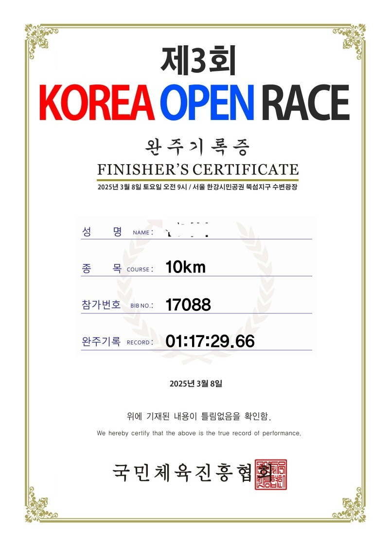 새벽 4시에 잠을 깼다. 오늘은 코리아오픈레이스 마라톤 대회에 참가하는 날이다. 뚝섬유원지에서 출발하여 한강변을 달린다. 오늘 참가는 남다른 의미가 있어서 그런지 더 잠이 올 거 같지 않았다. 주섬주섬 짐을 챙겼다. 깊은 잠에 빠져 있는 아내를 물끄럼히 바라봤다. 아내가 오늘 완주할 수 있을까 내심 걱정이 되었다. 오늘 대회는 아내와 사위, 딸 이렇게 온 가족이 참가한다. 10km. 나는 하프코스.