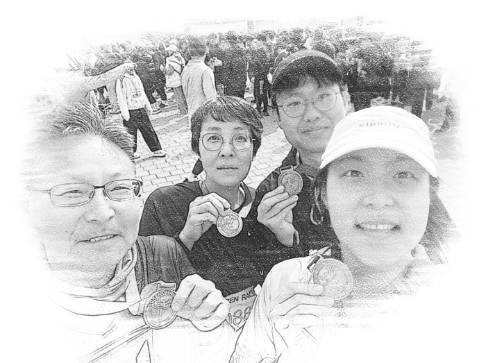 나는 아내를 살짝 껴앉아 주었다. 아내가 멋쩍은 웃음을 지었다. 완주 메달을 받고 우리 넷은 멋진 포즈로 사진을 찍었다.