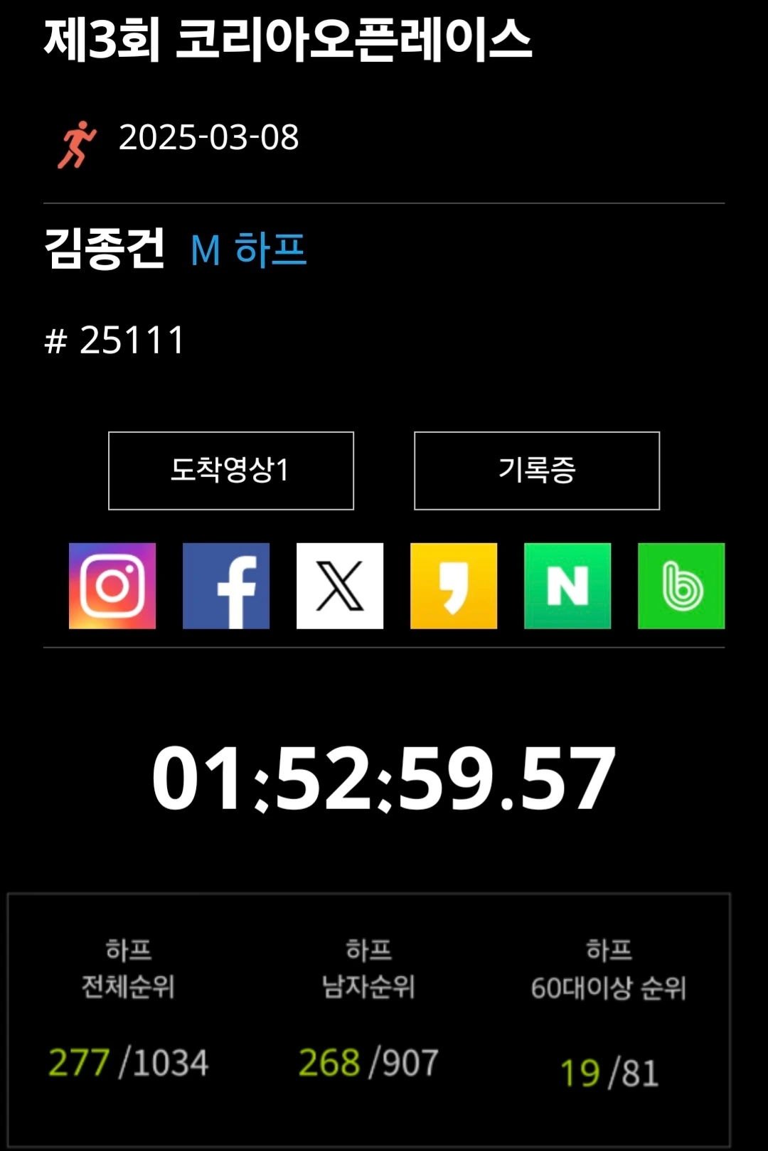 온 가족이 함께 달리는 의미가 남달랐다. 그런데 오늘 나는 나의 기록을 단축해 보려는 욕심을 갖고 있었다. 나의 하프코스 최고 기록은 1시간 45분(2023. 11월 대회). 하지만 나는 결과적으로 그것보다 한참 늦은 1시간 52분에 들어왔다.