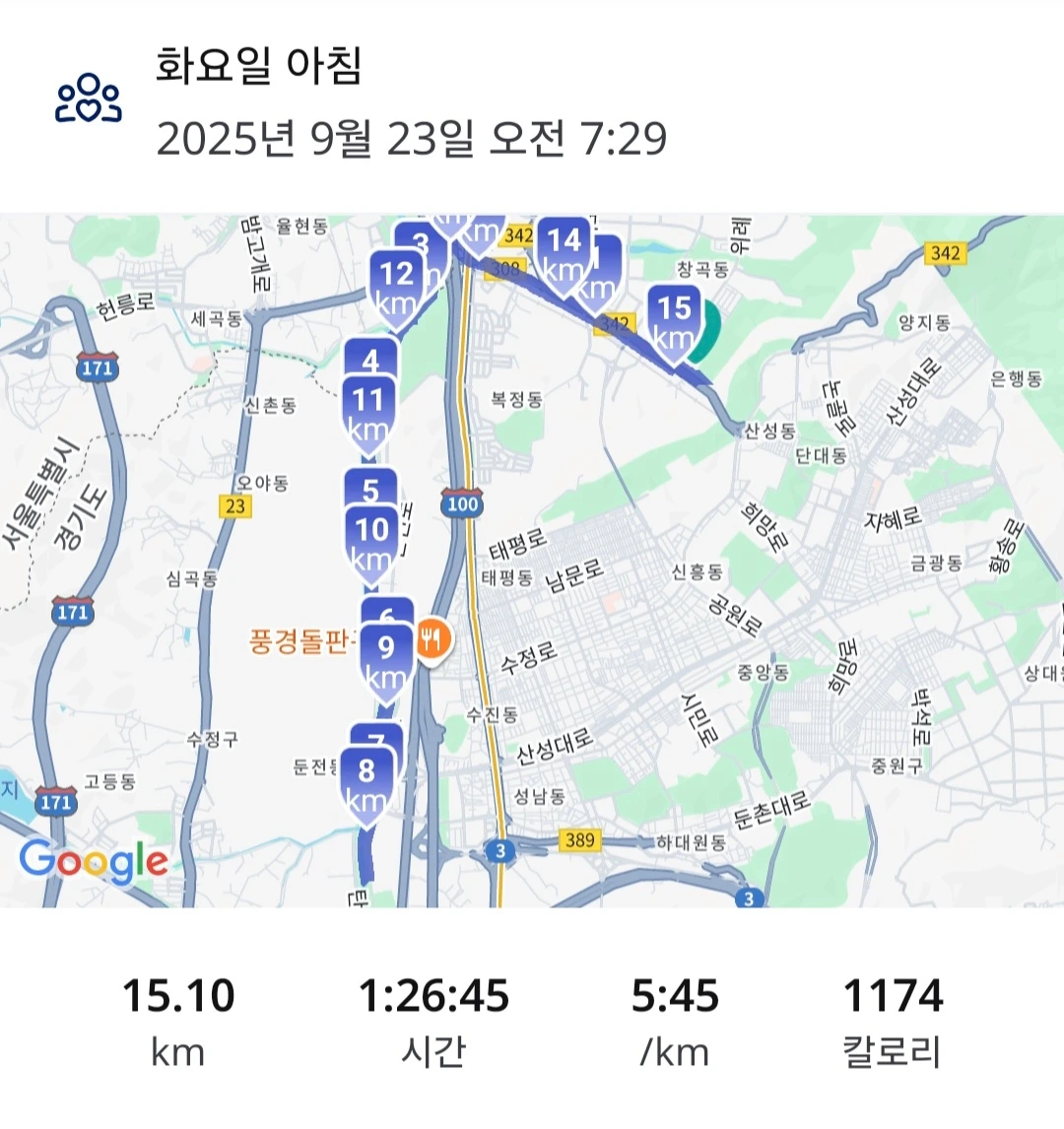 올해부터인 거 같은데... 한번 뛸 때 거리가15km로 늘어났다. 뛰는 김에 조금 더 뛰자며 반환점을 뒤로 두었다. 거리가 어떻든 6분/km을 넘기지 않겠다며 페이스를 유지하며 뛴다. 그렇게 뛰다 보면 대개 05:40/km. 이 기록으로는 하프코스 두 시간이 힘들다. 그래서 가끔은 조금 빨리 달리기도 하고. 이런 연습기록은 실제 대회에서 하프코스 대략 1시간 55분으로 나타난다. 그날 컨디션에 따라 1시간 50분 이내가 되기도 하고.