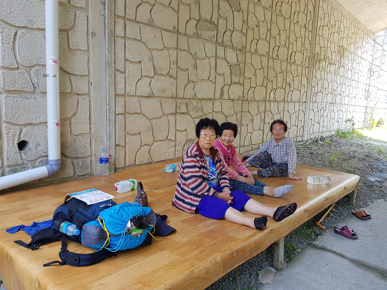 먹는 물도 떨어져 가는데 주유소나 가게도 없고 해서 나는 경산시 남천면 대명리에서 25번 국도를 벗어나 남천면사무소 방향으로 틀어 구 길로 걸어 들어갔다. 좀 돌아가는 거지만 한낮 내리쬐는 태양을 그대로 받으며 넓은 길을 걷는 것보다는 걷기는 훨씬 좋았다. 남천면사무소 인근의 가게에서 생수와 빵을 사서 배낭에 넣었다. 한참을 걸으니 중앙고속도로가 위로 지나가고 고속도로 다리 밑 널찍한 평상에 할머니들이 쉬고 있었다. 어디나 다리 밑은 더위를 피하고 쉬기 좋은 피서지다. 할머니들은 여기가 자기들의 경로당이라며 나보고 쉬어가길 권했다. 배낭을 풀고 앉는데 한 할머니가 먼저 말을 걸어왔다.