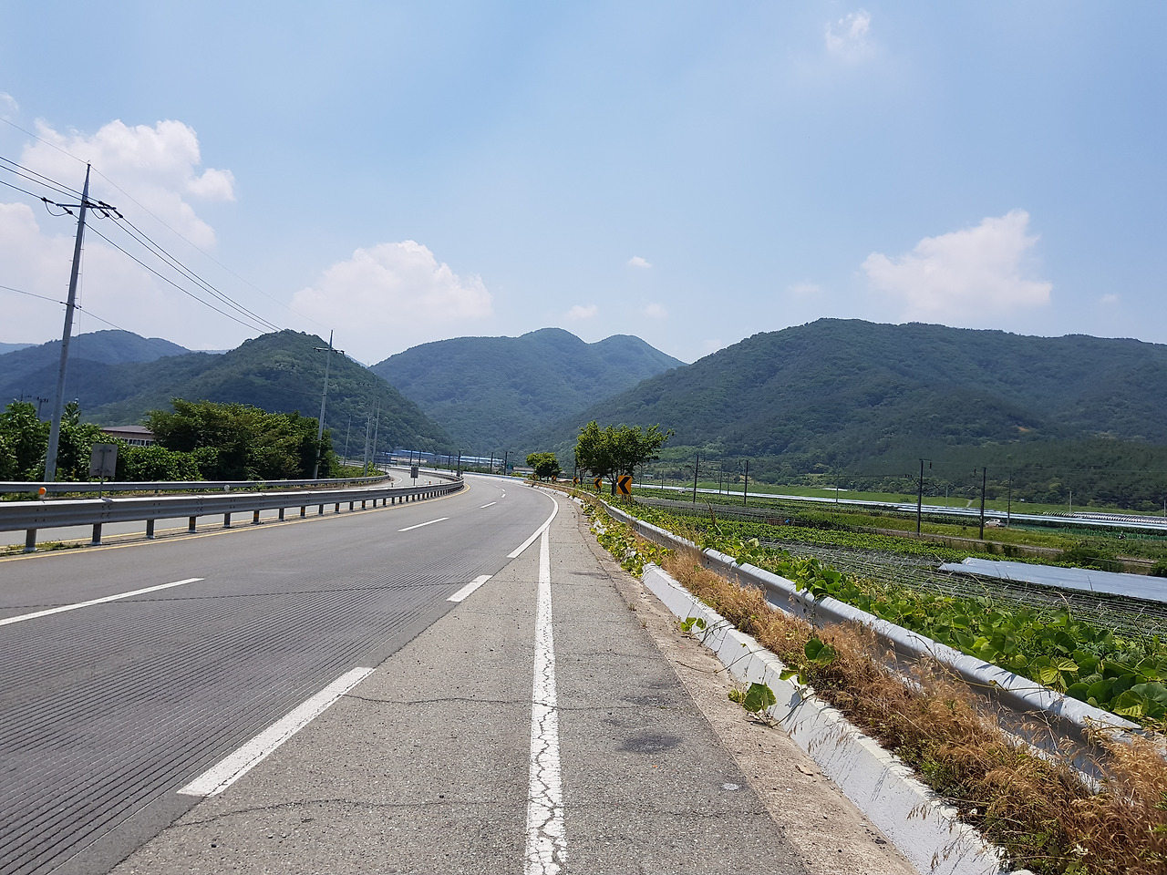 25번 국도는 왕복 4차선으로 넓고 차량은 뜸해서 오히려 걷기에 쓸쓸할 정도였다. 경산시에서 청도읍 가는 25번 도로는 가로수 하나 없는 뻥 뚫린 시멘트 포장길이었다. 시야가 트여 좋다고는 하지만 한낮의 더위와 시멘트 포장도로에서 느껴지는 삭막함이 마치 황량한 사막 위를 혼자 걷는 기분이었다.