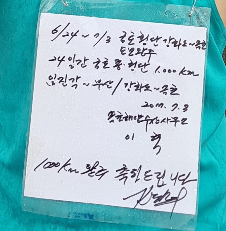 나와 후배는 아바이마을을 지나 청호대교를 건너 속초항으로 걸었다. 속초항 속초해양수산사무서 앞에 도착했다. 드디어 24일간 1,000km 국토종횡단의 대장정이 끝났다. 오늘 걸은 거리는 27.5km, 24일간 총 걸은 거리는 1,015.3km. 시간은 2017년 7월 3일 오후 4시 26분.