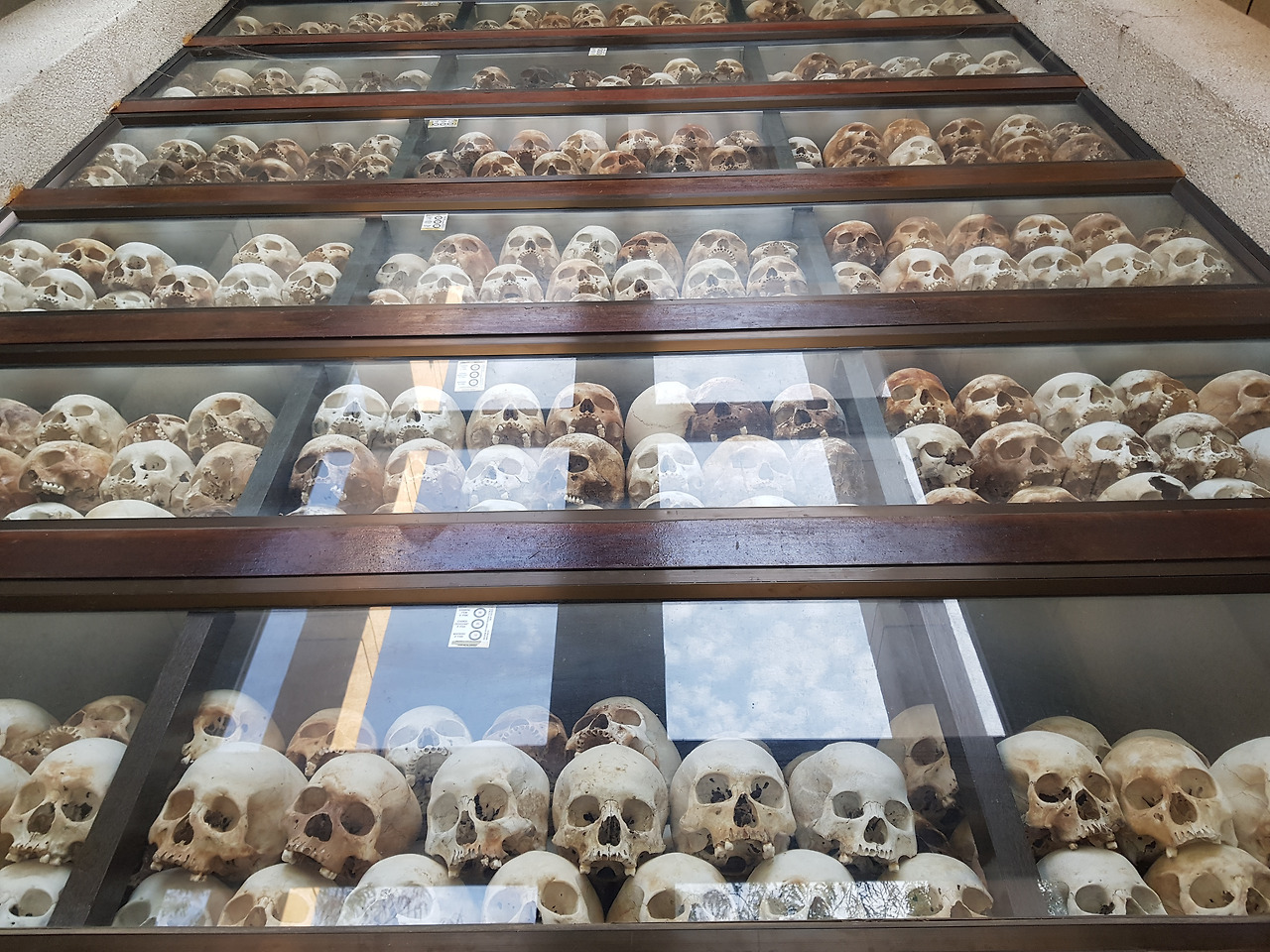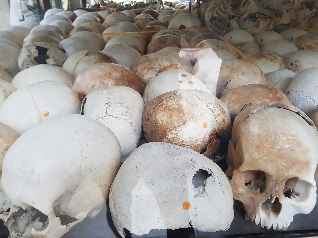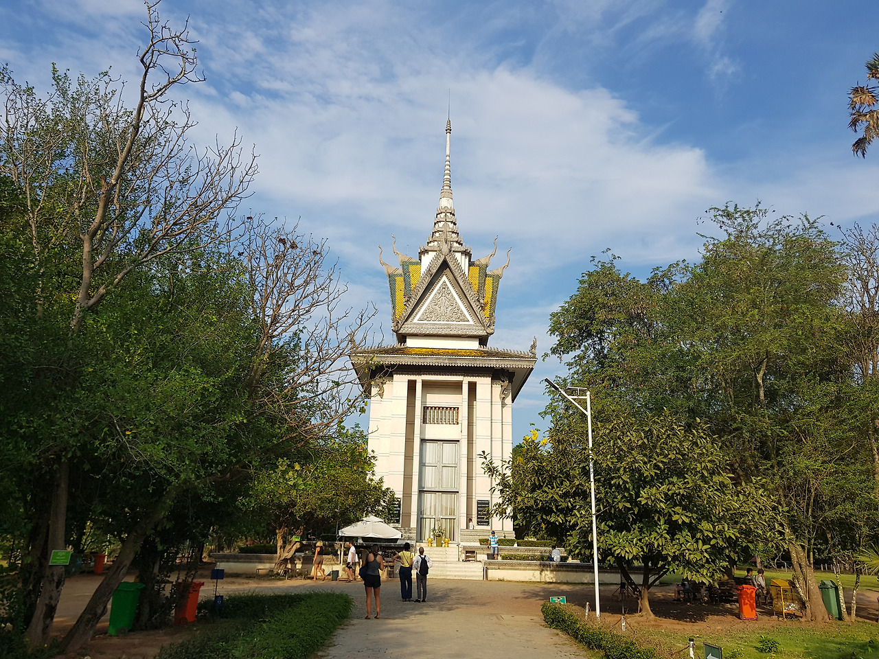 입구에서 들어서니 위령탑이 한눈에 들어온다. 잠시 묵념을 한 나는 신발을 벗고 위령탑에 들어가서 경악을 금치 못했다. 수많은 해골이 마치 나를 보고 인사하는 듯 했다. 미리 들어본 안내방송에서 해골의 깨진 모양에 따라 곡괭이로 맞아 죽은 사람, 망치로 맞아 죽은 사람 등을 구분할 수 있다는 데 나는 차마 그걸 구분해서 보기 위해 오래 볼 수가 없었다.