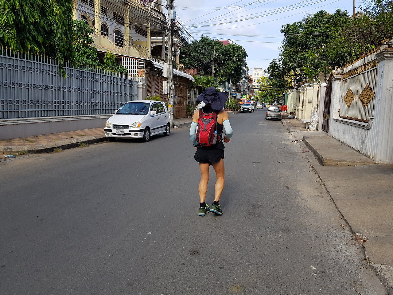 토요일 오후 3시 30분 나는 집을 나섰다. 프놈펜 숙소에서 킬링필드까지는 8.5km. 오전에 비가 많이 왔기에 오후에 뛰기 좋겠다 생각했는데 오전 11시쯤 날이 갠 후 달아오른 태양은 여전히 뜨겁다. 오후 3시 30분 온도는 34도를 가리키고 있다. 오늘 나는 구글 지도에만 의존하여 처음 뛰어가는 길이기에 8.5km를 한 시간 정도로 잡았다. 한 시간에 뛰어 닿고 한 시간 구경 후 다시 뛰어 돌아오는 거로 3시간의 시간을 예상했다. 갈 때 한 시간을 잡았지만 중간중간 사진을 찍어야 하기에 한 시간을 넘길 수도 있다. 그러니 너무 늦게 출발하면 돌아오는 시간이 어두워지기에 한낮의 열기가 아직 뜨겁지만 출발했다. 선크림을 잔뜩 바르고 팔토시를 하고 선캡 모자로 얼굴, 뒷목까지 보호한다.
